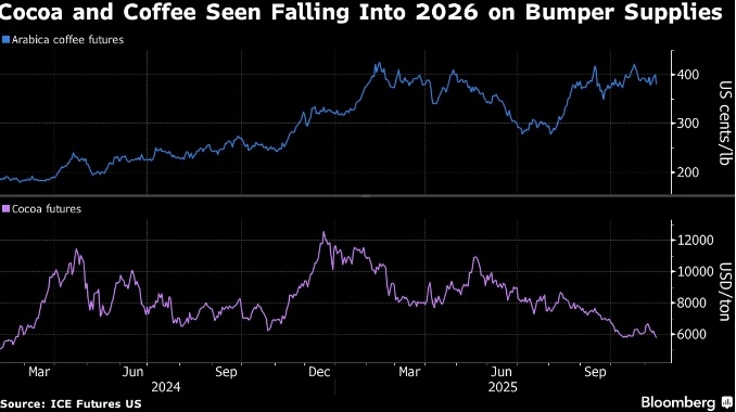 Цены на кофе и какао снизятся в 2026 году из-за обильного урожая, но рынки остаются уязвимыми к геополитике. Цены на арабику стабилизируются на уровне 2,50-3,50 доллара за фунт, а к 2027 году ожидается мировой избыток кофе. Цены на какао продолжат падать из-за роста производства и слабого спроса, а в 2027 году производство превысит потребление на 403 000 тонн. Согласно новому отчету аналитического отдела Rabobank, в следующем году ожидается снижение цен на кофе и какао из-за высокого урожая, который приведет к увеличению мировых запасов этих товаров. Однако сельскохозяйственные рынки остаются уязвимыми к геополитическим рискам. Аналитики Rabobank прогнозируют, что цены на арабику стабилизируются в диапазоне от 2,50 до 3,50 долларов за фунт после рекордного роста в текущем году. Краткосрочная волатильность может сохраниться, но в целом цены останутся на этом уровне. Ранее в этом году цены на кофейные зерна взлетели до 4 долларов из-за опасений по поводу сокращения производства в Бразили