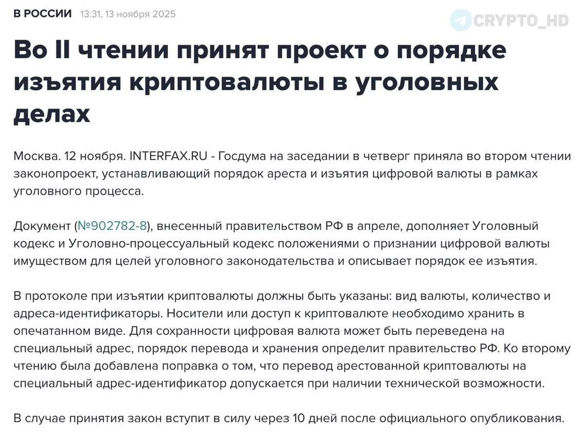 🇷🇺 Госдума приняла во II чтении правила изъятия криптовалюты. Депутаты одобрили законопроект, который устанавливает порядок ареста и изъятия цифровой валюты в уголовных делах. Документ закрепляет, что криптовалюта считается имуществом и может изыматься в рамках следственных действий. Что меняется: • В протоколе обязаны указывать вид криптовалюты, количество и адреса. • Носители, ключи и доступы будут хранить в опечатанном виде. • Активы смогут переводить на специальный государственный адрес при наличии технической возможности. • Следователи смогут работать с холодными и горячими кошельками, фиксировать данные и взаимодействовать с зарубежными биржами. • Стоимость активов можно будет определять по рыночной цене в любой момент. В случае окончательного принятия закон вступит в силу через 10 дней после официальной публикации. Полноценное применение начнется после того, как правительство утвердит подзаконные инструкции по переводу и хранению цифровой валюты. Ранее: изъятие крипты C