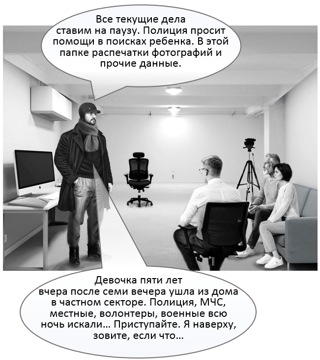В эмоциональном плане тяжелое было дело. Воскресным утром мы с Любой пришли в подвал потренироваться, Павел уже ждал нас там. Внезапно приехал Дима. Все эпизоды по этой ссылке Павел предложил Любе начать поиск. Люба отобрала несколько фотографий, открыла ПВА (ПВА — пространственно-временная аномалия), устроилась поудобнее и начала перебирать фотографии, пытаясь сосредоточиться на образе ребенка. Павел был рядом с Любой, я — в роли диванного наблюдателя. Аномалия сначала молчала, а потом откликнулась яркими картинками: детский сад, игры, друзья, катание на санках, папа, мама, бабушка, мультики, большая кукла, игривая кошка, интерьеры уютного дома, темнота во дворе… Люба начала подбираться к текущему моменту, характер изображений изменился. Темнота, снег, лес, овраг, маленькое тело внизу в неестественной позе… Какой-то предмет, похожий на детский сапожок, валяется в метре от тела, из капюшона курточки вытекает нечто темное, окрашивая снег… Люба вскрикнула и в ужасе закрыла лицо рукам