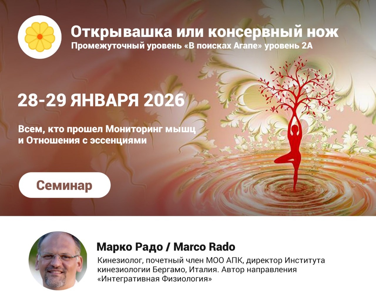 Дорогие друзья!🌿 Приглашаем Вас на семинар "Открывашка или консервный нож", который будет проведен с 28 по 29 января 2026 года Семинар проводит Марко Радо — Кинезиолог, директор Института кинезиологии(Италия) Это семинар полной программы обучения Прикладной физиологии ☝️ На этом двухдневном семинаре будет введена голографическая модель акупрессуры 💫 Модель двух сигнальных точек приведет нас к особой акупунктурной командной точке, предписанной системой акупрессуры Модели семи элементов ✨ Мы научимся определять специфические состояния мышечного стресса, которые прерывают равновесие потока энергии, идущего через акупунктурные точки. Этот поток можно сбалансировать через применение цветочных эссенций, цвета, света, через глубокое воздействие, через нейролимфатические и нейрососудистые стимуляции, звук, аффирмации Подробнее о семинаре можно узнать в личных сообщениях группы ВК или по ссылке — https://kinesioportal.ru/events/2532/4738.php