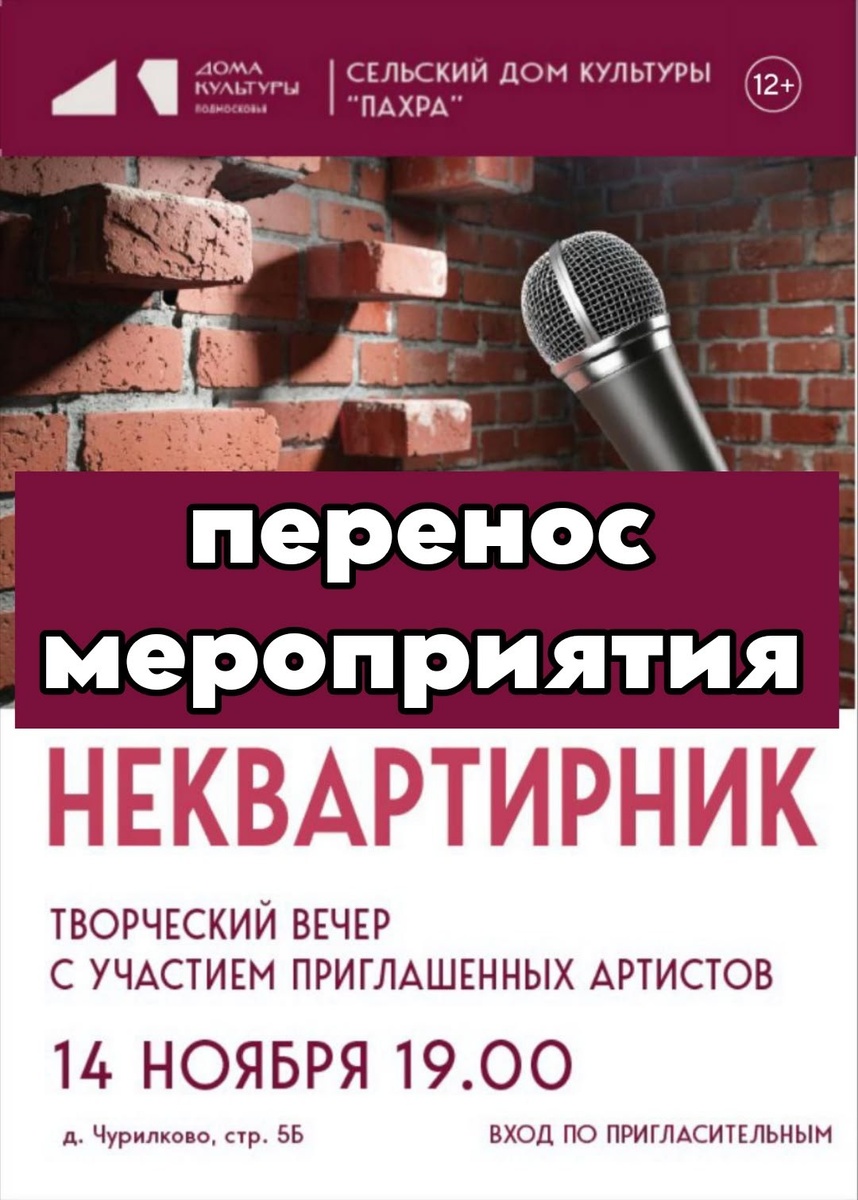 ✨ НОВОСТИ. Творческий вечер «НеКвартирник» переносится. О новой дате проведения будет сообщено дополнительно 🏢 Сельский дом культуры (СДК) «Пахра» 📍 г.о.Домодедово, дер.Чурилково, ул.Чурилково, д.5Б ✅ Мероприятия Домодедово https://dzen.ru/id/66f10385cc4c5a16f7b5fb02 http://vk.com/domodedovo_events http://dzen.ru/domodedovo_events