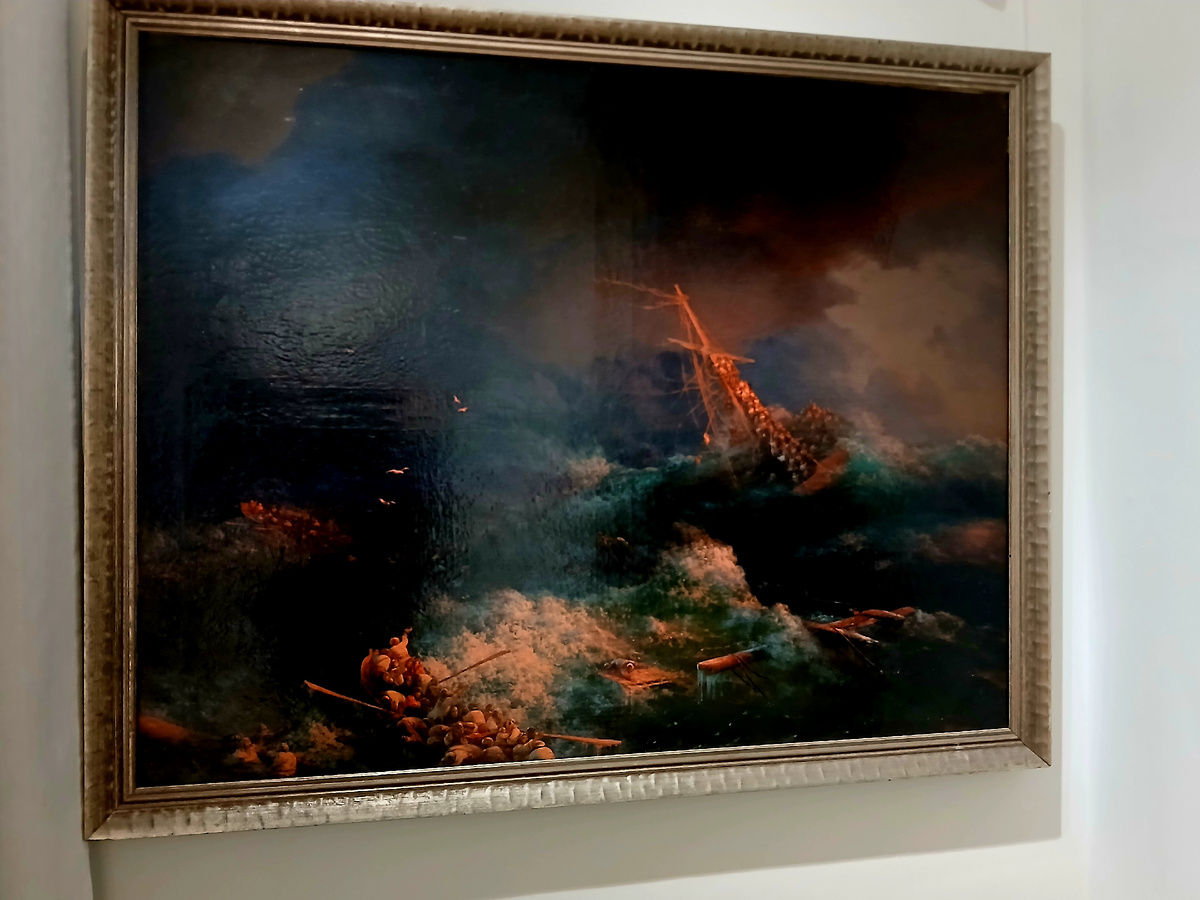 Ровно год назад была на выставке «В фарватере Айвазовского» в Челябинском государственном музее изобразительных искусств. Экспозиция включала живопись и мемориальные предметы из собрания Центрального военно-морского музея Санкт-Петербурга. Самого Айвазовского было немного, но были работы других мастеров морской живописи, а также макеты кораблей и морских приборов. Разглядывала внимательно, как профессионалы изображают волны и корабли. Мне уже был интересен не только сюжет, но и как выбраны и смешаны цвета, манера и техника мазка у автора. Айвазовский Иван Константинович 1860г написал Крушение корабля "Ингерманланд"в Скагерраке в ночь на 31августа 1842г. не менее мрачная его картина "Кораблекрушение у Афонской горы" 1856 г. Прощание 1869 (очень популярный сюжет в то время в искусстве романтизма) Эскиз к картине «Русская эскадра в Тулоне в 1893г» автор Гриценко Николай Николаевич (1856-1900). Чтобы выполнить рисунок потребовалось разрешение французского правительства. Сама картина был