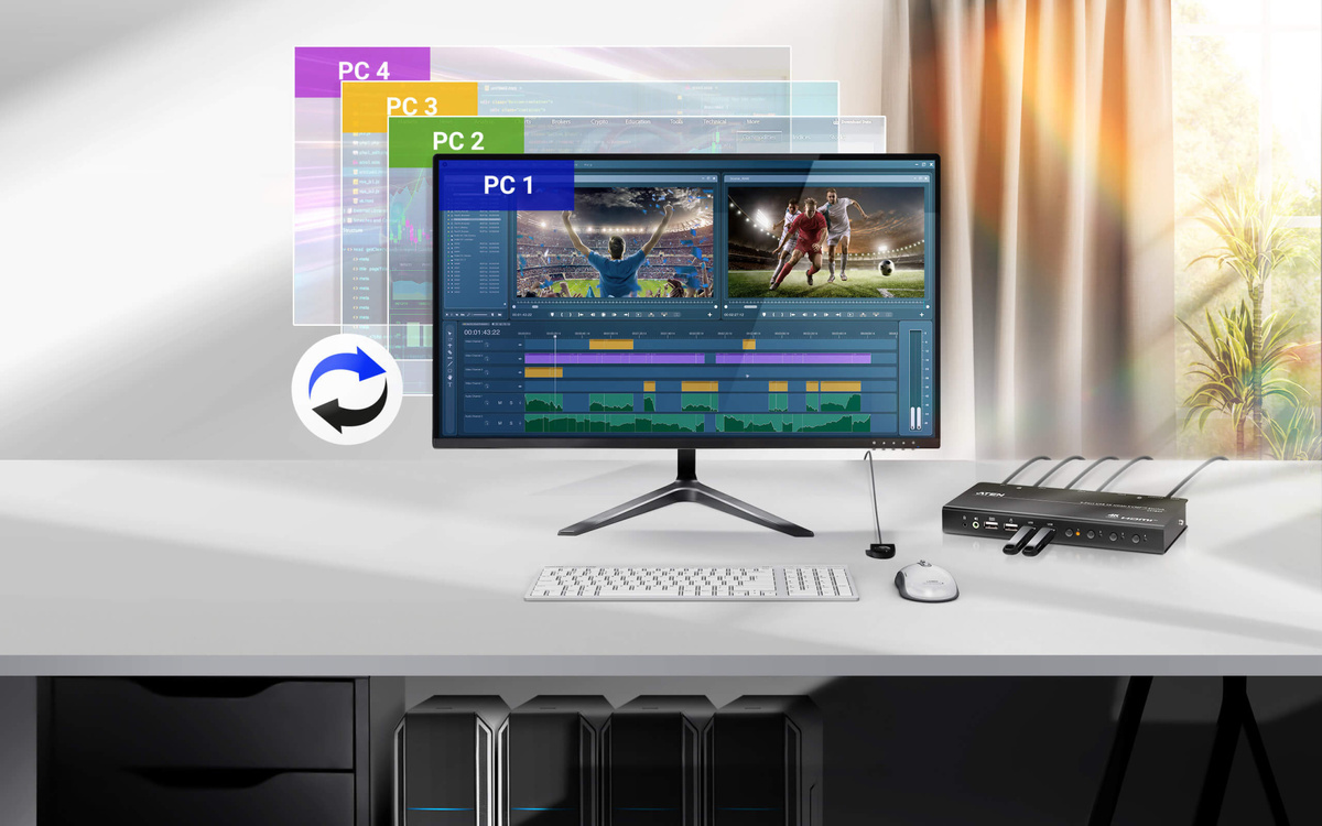 Управляйте четырьмя компьютерами с одной консоли без хаоса: новый KVM-переключатель ATEN CS784H организует ваше рабочее пространство и повысит продуктивность. В эпоху многозадачности и гибридной работы профессионалы все чаще сталкиваются с необходимостью одновременного управления несколькими компьютерными системами. Компания ATEN представляет инновационное решение — 4-портовый настольный KVM-переключатель CS784H, который кардинально меняет подход к организации рабочего пространства. KVM-переключатель CS784H создает эргономичную рабочую среду, позволяя управлять четырьмя компьютерами с помощью одной клавиатуры, мыши и монитора. Это не только освобождает ценное пространство на столе, но и избавляет от хаотичного переплетения кабелей, создавая аккуратную и продуктивную рабочую атмосферу. Устройство поддерживает разрешение DCI 4K (4096 × 2160) при 60 Гц и сверхширокое 5120 x 1440 при 60 Гц, обеспечивая кристально четкое изображение для работы с графикой, видеомонтажом и другими требователь