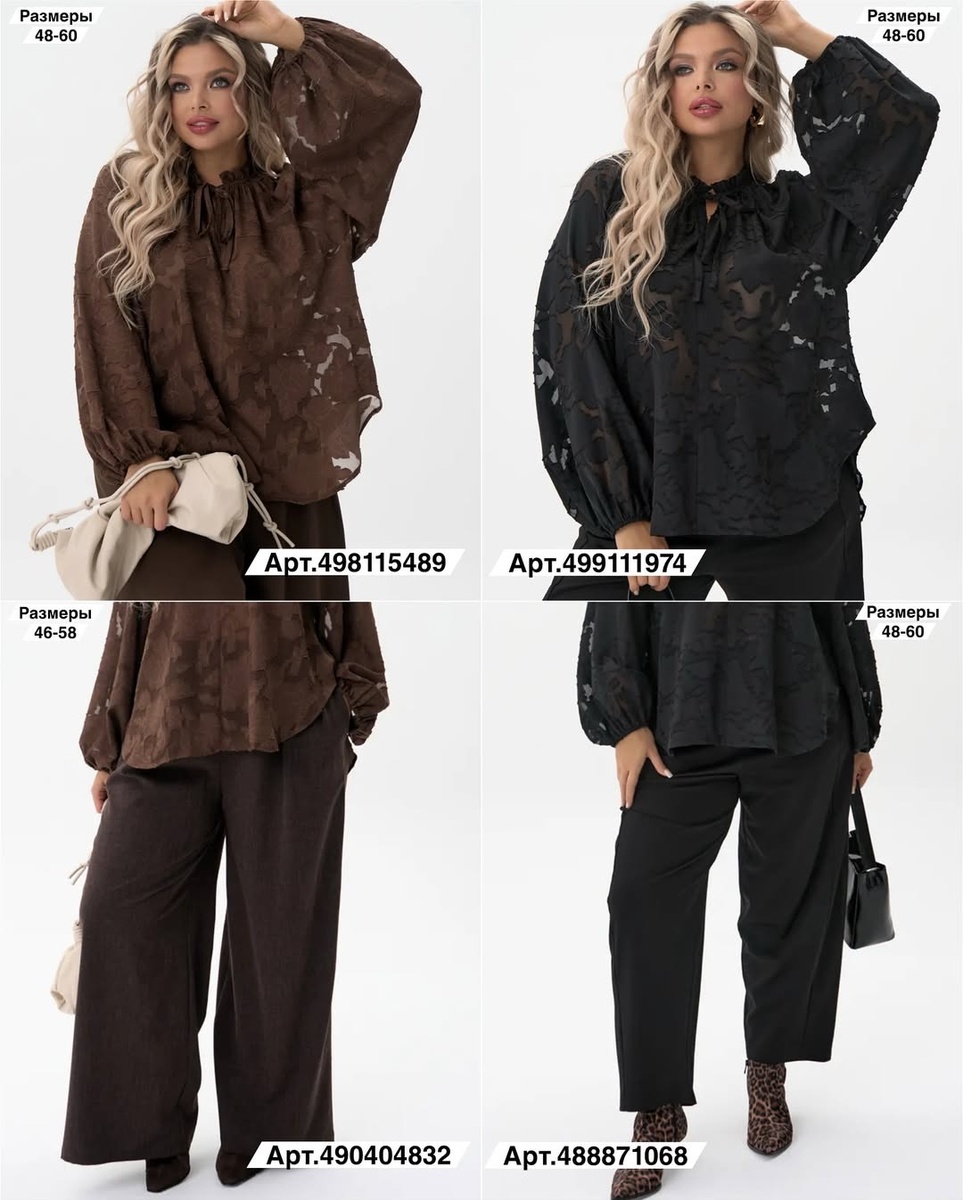 - шоколадные и чёрные блузы арт. 498115489 и 499111974 — для нарядных и повседневных образов;