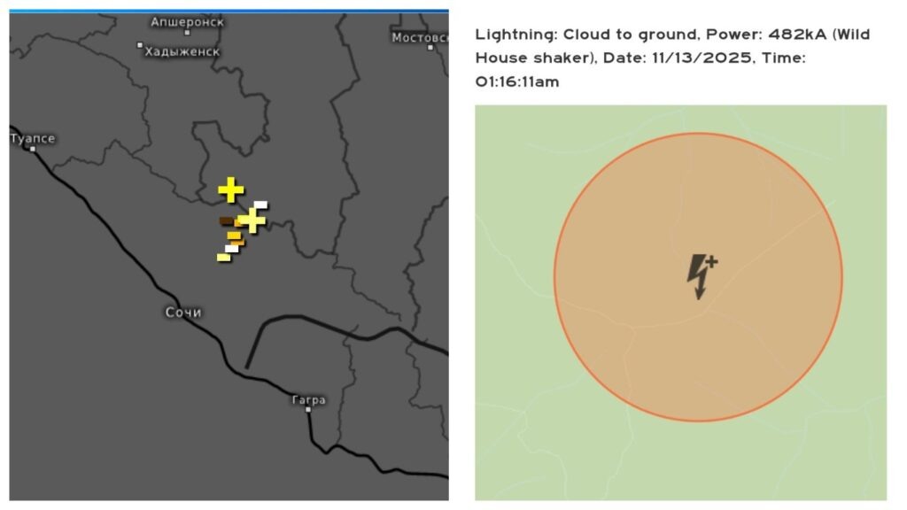 В ночь на 13 ноября к северу от Сочи специалисты зафиксировали серию мощных молний. Одна из них достигла силы тока 482 килоампера, что примерно в 24 раза превышает средний показатель при обычных ударах. Звук от таких молний напоминает работу ПВО, — написал в телеграм метеоролог Михаил Кокорин. Синоптики связывают редкую по мощности активность с контрастом температур и высокой влажностью воздуха у побережья. Грозовая активность сохраняется в регионе уже несколько дней подряд. Специалисты советуют соблюдать меры безопасности и не выходить на открытые участки во время непогоды. Ранее «Краснодарские известия» писали, что 12 ноября Землю накрыла экстремальная магнитная буря.