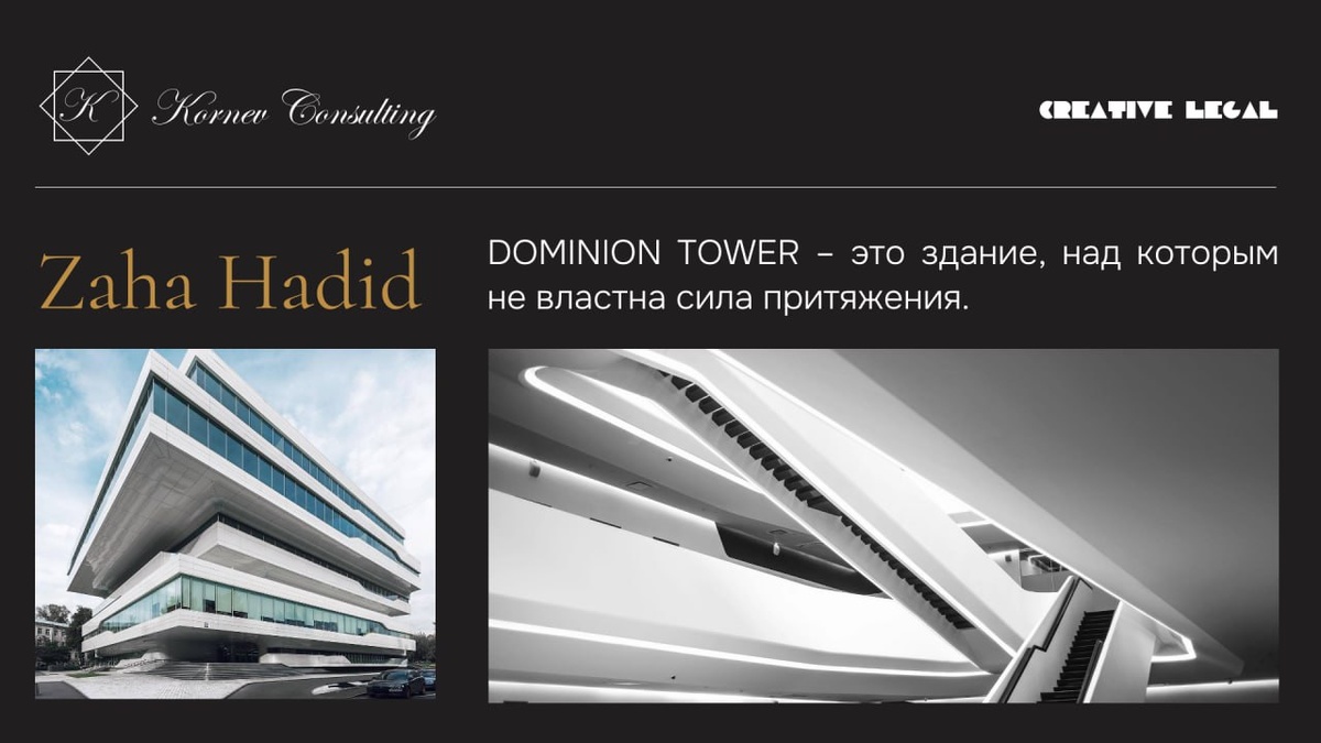 В рамках нашего нового направления «Creative Legal» мы будем исследовать мир креативных индустрий через призму права и эстетики. Отправляемся в архитектурное путешествие по самым значимым современным зданиям России и мира, и сегодня расскажем о, на наш взгляд, самом артхаусном сооружении России — единственном реализованном проекте Захи Хадид в Москве, бизнес-центре Dominion Tower. Гений места: Заха Хадид. Заха Хадид (1950-2016) — ирако-британский архитектор, первая женщина-лауреат Притцкеровской премии (2004), чье творчество переопределило границы современной архитектуры. Ее почерк, сформированный под влиянием русского авангарда, узнаваем по футуристическим формам, динамичным линиям и радикальным пространственным решениям. Dominion Tower стал одним из последних проектов, реализованных при ее жизни. Воплощение идеи: от концепции к реальности. Заказчик и концепция. Проект был инициирован группой компаний «Пересвет»/Dominion-M Ltd, стремившейся создать не просто офисный центр, а архитекту