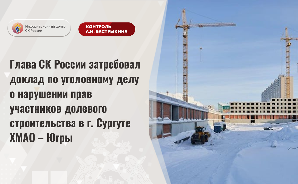 Глава СК России затребовал доклад по уголовному делу о нарушении прав участников долевого строительства в г. Сургуте Ханты-Мансийского автономного округа – Югры В Информационный центр СК России обратились жители города Сургута Ханты-Мансийского автономного округа – Югры по вопросу нарушения прав участников долевого строительства ЖК «За ручьем» компанией АО «Специализированный застройщик «ДСК-1». В прошлом году заявители заключили договоры с организацией на приобретение квартир в строящемся доме, оплатив их. Однако срок ввода строения в эксплуатацию неоднократно переносился, последний раз - на июнь 2027 года. В результате граждане вынуждены проживать в арендованных жилых помещениях. Многочисленные обращения в различные инстанции результатов не принесли. В СУ СК России по Ханты-Мансийскому автономному округу – Югре возбуждено уголовное дело. Председатель Следственного комитета Российской Федерации Александр Иванович Бастрыкин затребовал у руководителя СУ СК России по Ханты-Мансийскому а
