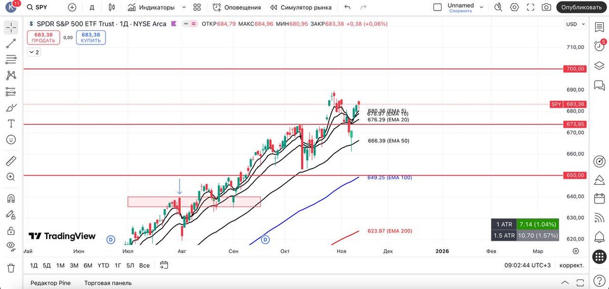 ВЫВОД: продолжаем наблюдать силу ротационной отрасли, благодаря чему $SPY удается удерживаться у локального максимума. $S1FD подошел к уровню 90%, что говорит о возможных красных днях. Однако красные дни могут проявиться на таких индексах, как $DIA и $RSP. Как я ранее писал, в этот момент могут подключиться техи и полупроводники: $QQQ, $IXIC, $MAGS, $XLK, $SMH — которые в данный момент рисуют подхват скользящих на 20 EMA D + $VIX реагирует на паутину из скользящих и закрывается фитилем сверху = за счет бигтехов рынок может начать сквизовать. #spy #технический_анализ #америка #трейдинг_сша #фондовый_рынок #обзор #вывод #qqq #vix #smh #mags #xlk #ixic
