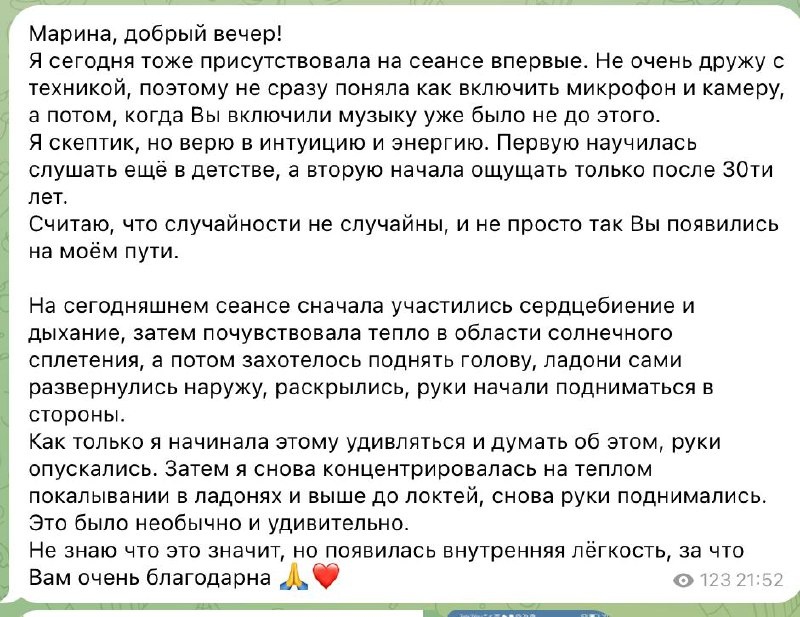 Мои хорошие, завтра в 19:00 МСК мы встретимся на безоплатном демо-сеансе наполнения энергией! 💫 Перед тем как мы начнём, хочу поделиться с вами историями тех, кто уже прошёл мои сеансы и получил свои результаты. Это не сказки, мои дорогие, — это реальные изменения, которые возможны для каждой из вас! 🙌 История Галины, 55 лет: “Марина, я пришла к вам с сильной депрессией, алкогольной зависимостью и зависимостью от фенозипама — принимала по 5 таблеток ежедневно на протяжении нескольких лет. Улучшения начались уже после первого сеанса! Появилось отвращение к спиртному, я стала активной, начала посещать театры, открыла своё дело. Полностью прекратила пить фенозипам. И что удивительно — рассосался шрам под глазом, который был много лет!” 💚 История Елизаветы, 35 лет: “Обратилась к Марине со сложностями в отношениях, депрессией и полным отсутствием сил. После 3-х сеансов появилась энергия, депрессия постепенно ушла. Через полгода познакомилась с прекрасным парнем. Сейчас мы живём вмест