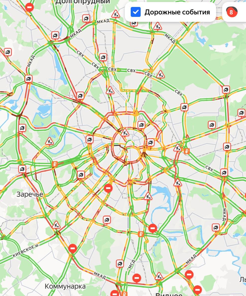 🚗 Москва встала: 8‑балльные пробки Из‑за перекрытий в центре тянет Садовое и прилегающие улицы — местами движение почти стоит. Закладывайте время и по возможности объезжайте центр. Как у вас с дорогами?