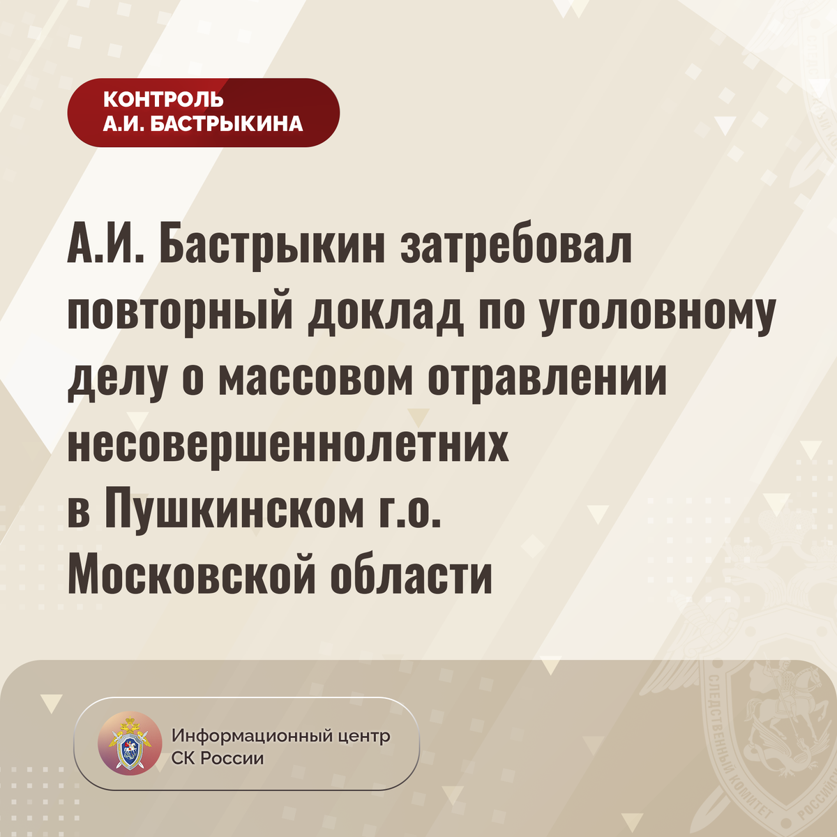 А.И. Бастрыкин затребовал повторный доклад по уголовному делу о массовом отравлении несовершеннолетних в Пушкинском г.о. Московской области