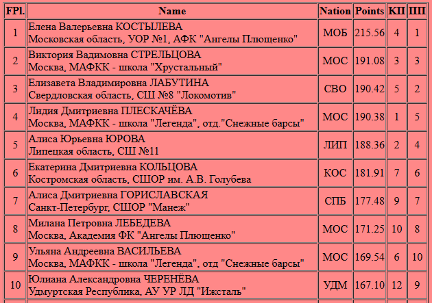 Лидия Плескачева (190.38 - 4 место) за несколько недель активных тренировок, оказывается, не только восстановила все тройные прыжки, но и тройной аксель. Впереди работа над физической формой, которой сегодня не хватило. Начало было обнадеживающим, а вот во второй половине программы абсолютно все прыжки были исполнены с недокрутами. Буквально на один недокрутик меньше и Лида была бы второй-третьей, но судьи сегодня были непреклонны.