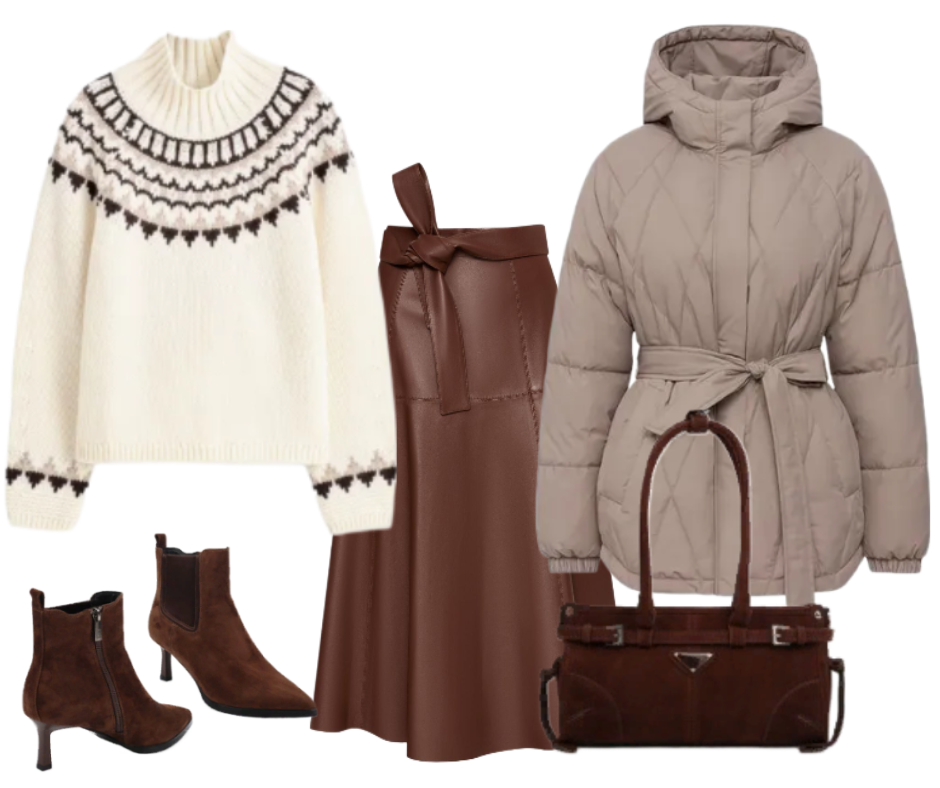 Холодный сезон – не повод отказываться от женственных и элегантных образов. Юбка, этот вечный символ женственности, прекрасно адаптируется к зимним условиям, предлагая бесконечное поле для модных экспериментов. Забудьте о скучных брюках и джинсах, ведь сегодня мы отправимся в настоящее юбочное путешествие, где каждый образ – это произведение искусства, созданное для вашего вдохновения. Кожа – идеальный материал для холодного сезона, она не только стильная, но и хорошо защищает от ветра. Коричневая юбка чудесно смотрится с свитером со скандинавским узором в нейтральном цвете. Стеганая куртка с поясом подчеркивает талию. Коричневые ботильоны и сумка из замши аналогичного цвета удачно дополняют ансамбль. Сочетание алого и изумрудного – это классика, которая всегда выглядит выигрышно. Черное пальто уравновешивает яркость юбки. Детали: черные ботинки, черная сумка, леопардовый шарф.
