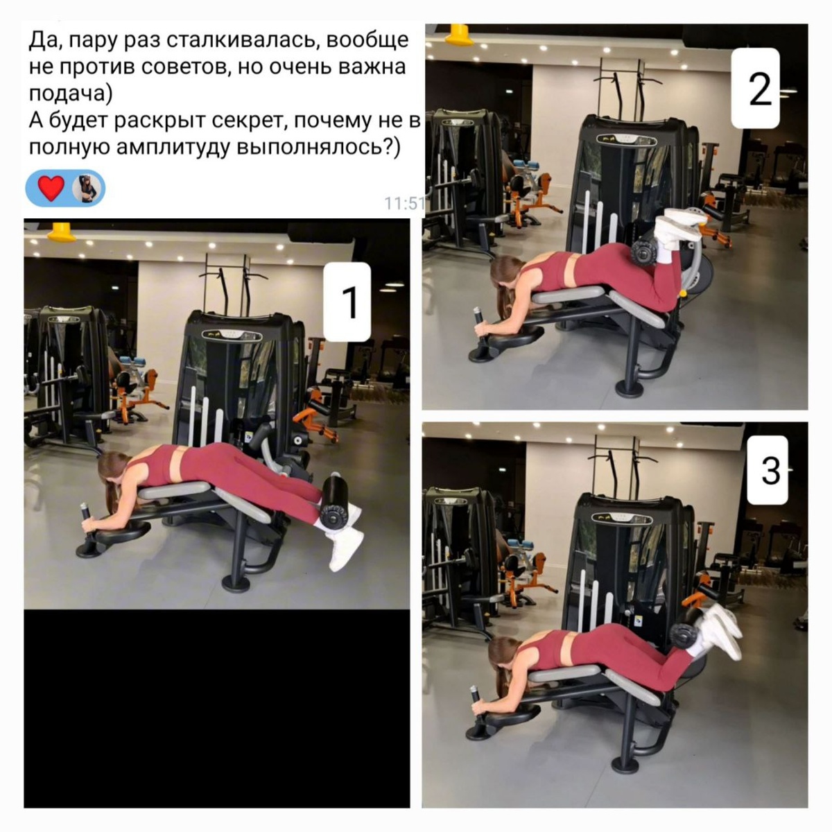 Для любознательных и пытливых умов раскрываю секрет неполной амплитуды в упражнении "сгибание ног лежа" ("сгибание голени лёжа в тренажёре") ❗️Пост душный, поэтому если не захотите читать я не обижусь, но выводы прочтите🙂 ✨Тут работает задняя поверхность бедра и немного икры. ➡️Внизу, где ноги опущены (фото1⃣) задняя поверхность бедра максимально растянута, а вверху, где ноги согнуты (фото2⃣) - сокращена. ➡️В растянутом положении (1⃣) мышца сильнее, поэтому выгоднее чтобы она максимально работала именно внизу, это даст ей бОльший стимул для роста. В сокращенном положении (2⃣) она наоборот слабее, но в этом положении нагрузка на нее максимальна (это не самый лучший вариант). 💡По имеющимся данным, тренировка мышцы в растянутом положении, вероятнее всего, способствует её бОльшему росту. ➡️Таким образом, я тренирую мышцу примерно на среднем участке амплитуды (фото3⃣), где она ещё максимально НЕ сокращена и при этом способна производить силу и сопротивляться бОльшему весу ➡️ то есть