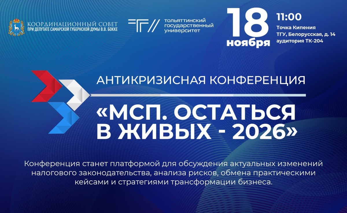 📢 В ТГУ пройдёт антикризисная конференция Тольяттинский госуниверситет и Координационный совет при депутате Самарской Губернской Думы Владимире Бокке организуют Антикризисную Конференцию «МСП. ОСТАТЬСЯ В ЖИВЫХ – 2026». На конференции представители малого и среднего бизнеса обсудят нововведения, обменяются практическими кейсами и стратегиями трансформации бизнеса. 📅 18 ноября ⏰ 11:00 📍 Точка кипения ТГУ (ул. Белорусская, 14Б) 📌 Участие в конференции бесплатное. Необходима регистрация по ссылке. Если вы хотите, чтобы ваш вопрос был рассмотрен спикером во время выступления, а также в блоке «Живой диалог» – направьте его заранее (не позднее чем за 3 рабочих дня до мероприятия) на e-mail: nmuromets@yandex.ru Подробности👈