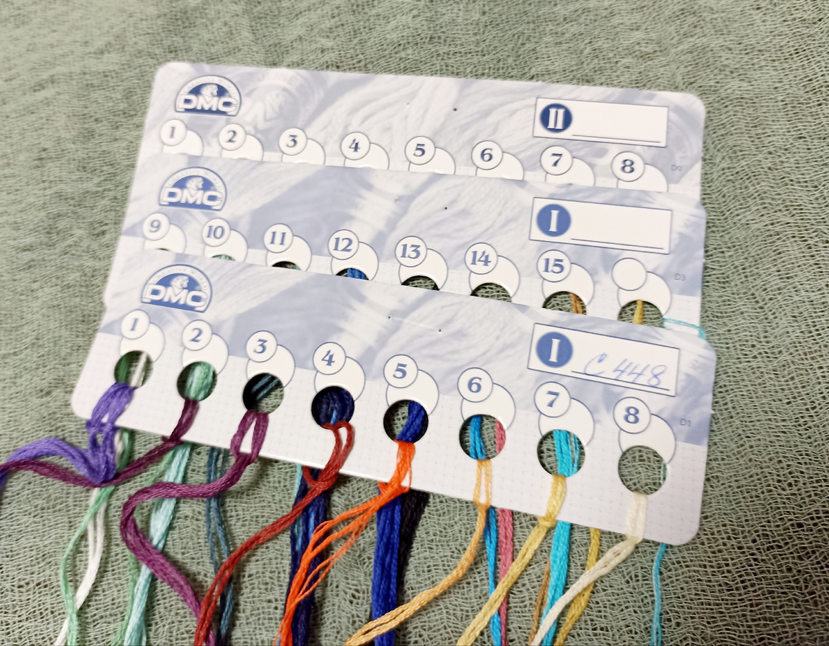 Оказалось, что наборы РТО имеют свои, скажем так, особенности, и к ним нужно привыкнуть. Во-первых, это органайзеры. В схеме 23 цвета + 1 бленд, нитки развешаны на три органайзера по 8 номеров. Окей, но на первых двух планшетках навешаны номера 1-15 и стоит римская I, а на третьей планшетке стоит II и нумерация снова 1-8. Зачем? Во-вторых, это нарезка. Какие-то цвета нарезаны по 1м, какие-то по 50см, а какие-то пасмами и по 1м, и по 50см. Сначала я подумала, что короткая нарезка для блендов, это удобно, но в схеме всего один бленд, и у одного из цветов бленд