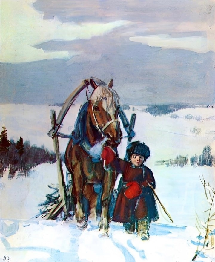 Однажды, в студеную зимнюю пору Я из лесу вышел; был сильный мороз. Гляжу, поднимается медленно в гору Лошадка, везущая хворосту воз. И шествуя важно, в спокойствии чинном, Лошадку ведет под уздцы мужичок В больших сапогах, в полушубке овчинном, В больших рукавицах… а сам с ноготок! «Здорово, парнище!» — «Ступай себе мимо!» — «Уж больно ты грозен, как я погляжу! Откуда дровишки?» — «Из лесу, вестимо; Отец, слышишь, рубит, а я отвожу». (В лесу раздавался топор дровосека.) «А что, у отца-то большая семья?» — «Семья-то большая, да два человека Всего мужиков-то: отец мой да я…» — «Так вот оно что! А как звать тебя?» — «Власом». — «А кой-тебе годик?» — «Шестой миновал… Ну, мертвая!» — крикнул малюточка басом, Рванул под уздцы и быстрей зашагал. ✍️ Николай Некрасов Однажды, в студеную зимнюю пору… (отрывок из стихотворения «Крестьянские дети»). 🎨 Художник Д.Шмаринов,«Н. А. Некрасов». 📚