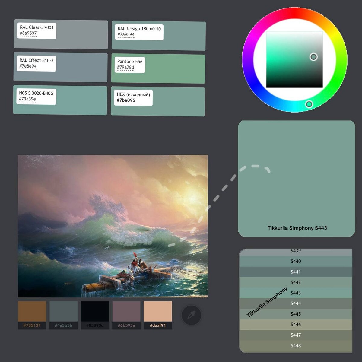 Хотите повторить цвет с картины? Легко! Знаете, в чем главная сложность работы с цветом? Даже благородный бежевый может предательски «позеленеть» на стене или уйти в скучную серость при неправильном освещении. Глаз улавливает малейший подтон, и вдохновляющая идея может разбиться о суровую реальность ремонта. Но что, если источник вашего вдохновения, например, картина? Допустим, вас покорил буйство красок на «Девятом вале» Айвазовского, и вы горите желанием перенести этот оттенок грозовой волны в свою гостиную. Как быть? Не гадать на кофейной гуще! Есть лайфхак для профессионалов и увлеченных новичков: 1️⃣ Находите вдохновляющее изображение (та самая картина). 2️⃣ Идите на сайт-палитру (например, get-color.ru). Загружаете картинку — и сервис моментально выдает вам палитру с цифровыми кодами цветов. 3️⃣ Используете конвертер цветов, чтобы найти ближайший оттенок в нужной вам системе — будь то Tikkurila, Dulux или Sherwin-Williams. И вот он, ваш идеальный «цвет волны Айвазовского», у