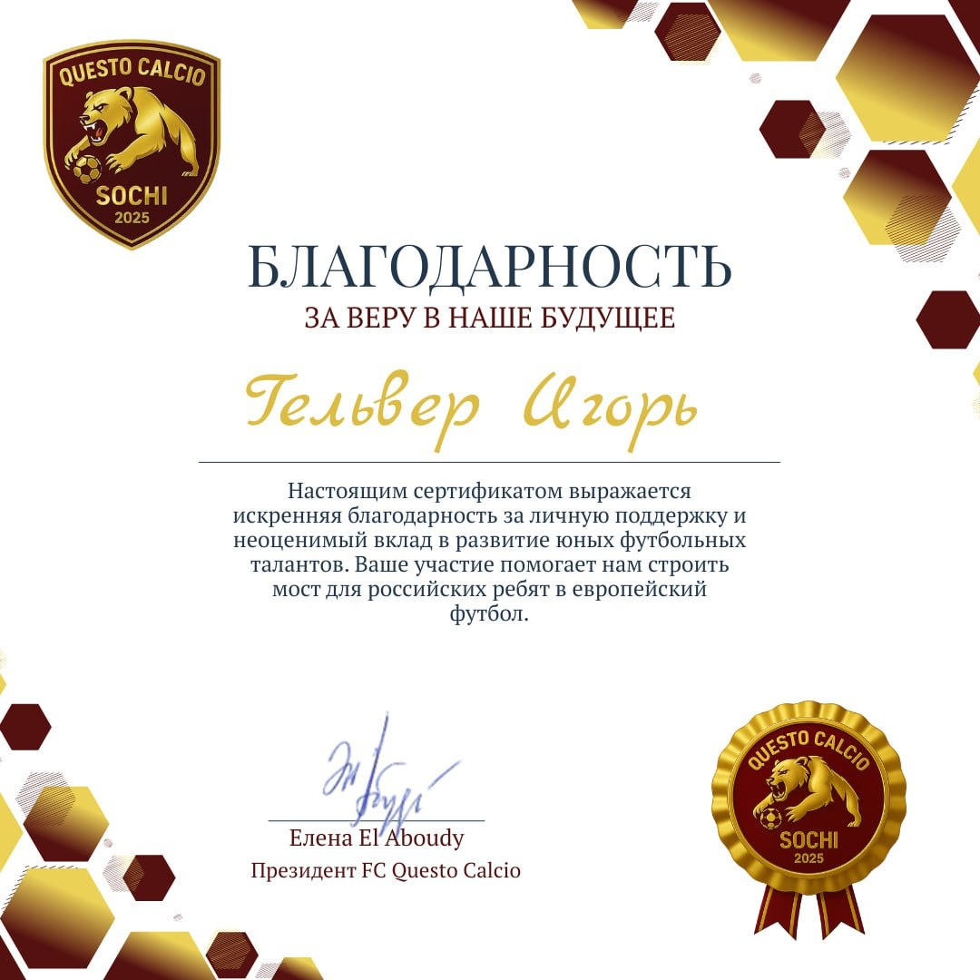 😊 Спасибо, что верите в Questo Calcio! Друзья, в работе с детьми особенно важна поддержка неравнодушных людей. И сегодня наша душа поет от счастья! 😊 Мы — не бюджетный клуб, мы растем на самофинансировании. Каждая форма и каждая поездка — это огромные усилия. И мы безмерно благодарны, что среди нас есть те, кто это видит и готов помочь. От всей души говорим СПАСИБО человеку с большим сердцем — Игорю Гельверу и его строительной компании «Серьёзное дело»! 🙏 Ваша поддержка — это не просто финансы. Это мощный сигнал нашим ребятам: «Мы в вас верим!». Для нас «Questo Calcio» — это не просто футбол. Это история длиною в жизнь. Это ответственность за каждого мальчишку, который мечтает о профессиональном контракте. Мы не ищем готовых звёзд — мы их создаём. И наша цель — дать им шанс заявить о себе не только в России, но и в Европе. Для спонсоров это уникальный шанс: ✔️ Стать частью реальных историй успеха — ваше имя будет связано со взлетом будущих звезд. ✔️ Создавать наследие — вли