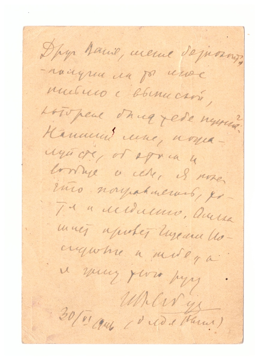 2 стр: Друг Ваня, меня беспокоит получил ли ты мое письмо с выпиской, которая была тебе нужна. Напиши мне, пожалуйста, об этом и вообще о себе. Я пока что поправляюсь, хотя и медленно. Олечка (прим. дочь Лебедева) шлет привет (2 слова неразборчиво) и тебе, а я жму твою руку. (подпись) ИВЛебедев (дядя Ваня). 30.06.1946