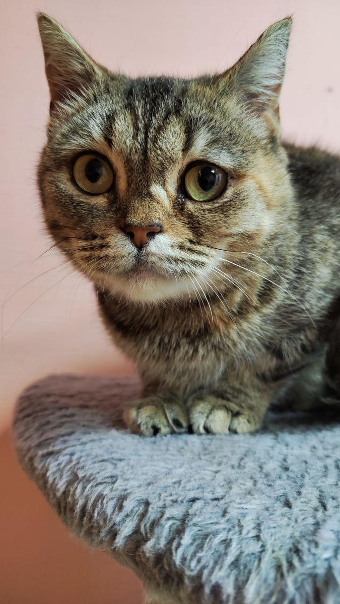 Принцесса была прекрасная - погода была ужасная... Маленькая принцесса со своими детишками была оставлена около холодного дома, люди уехали на зиму в город... Принцесса подошла к нам тихо, словно из сказки: серая с золотом - пушистая и нежная шерстка, большие округлые глаза с грустинкой и аккуратные лапки. На фото она — на своём миниатюрном троне (кошачьем домике) — любит забираться повыше и наблюдать за миром. Пока еще немного робкая, но очень любопытная и не против тихих ласковых голосов. Представьте: в далёком королевстве была принцесса, которой пришлось ждать и ждать — пока не найдётся тот, кто разгонит тучи одиночества одним тёплым прикосновением. Наша принцесса не просит золотых башен — ей нужен тёплый уголок, нежные руки и человек, который станет её принцем: тот, кто принесёт мисочку с любовью, тёплый плед и будет рядом. Принцесса может жить со спокойными сородичами, но больше всего она любит человека. Сначала кошечка будет осторожна, а потом, в объятиях, растает словно плом