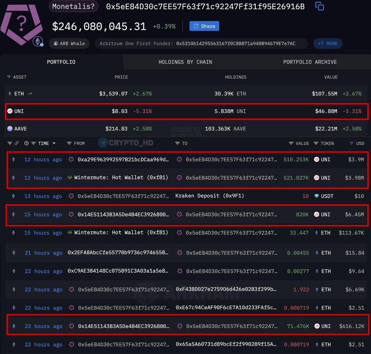💸 Monetalis активно покупает #UNI На кошелек компании поступило 1,92m UNI ($15m) от B2C2 Group, Wintermute и Flow Traders. Теперь на балансе уже 5,8m UNI ($46,8m). Monetalis – финтех-компания, которая помогает интегрировать реальные активы в DeFi, консультирует Sky (MakerDAO) и управляет RWA-портфелями. Crypto Headlines