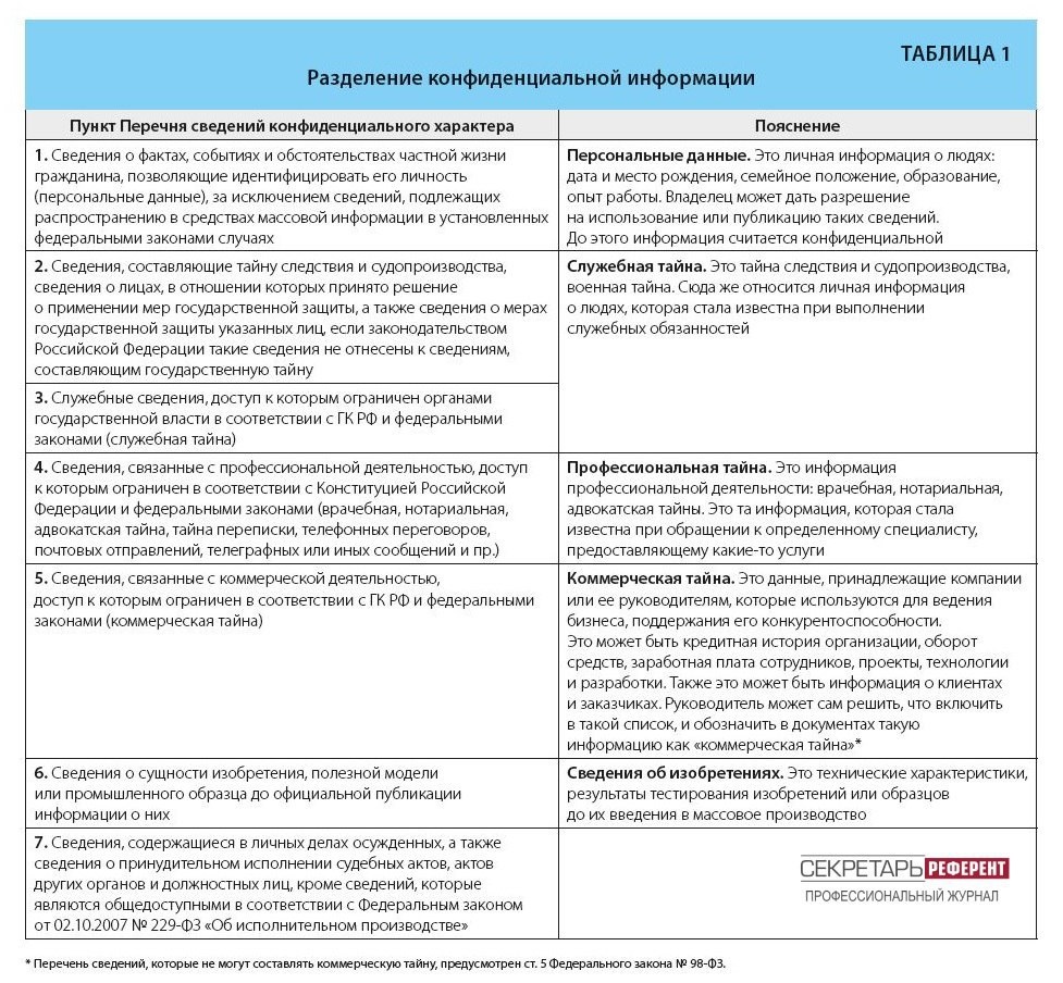 Конфиденциальную информацию можно разделить на следующие группы (Таблица).