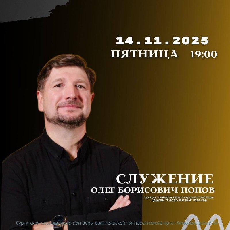 Добро пожаловать на пятничное служение! 📅 14.11.2025 🟡19:00 📍Сургут, пр-т Комсомольский 24 📎 Олег Борисович Попов ✝️ Пастор, заместитель старшего пастора церкви «Слово Жизни» г.Москва Дорогие, высвободите время для завтрашнего служения, приглашайте родных и знакомых. Rutube канал ВК страница церкви Не забудьте подписаться ✍️ Просьба разместить информацию в своих соц. сетях и мессенджерах. Репост и история.
