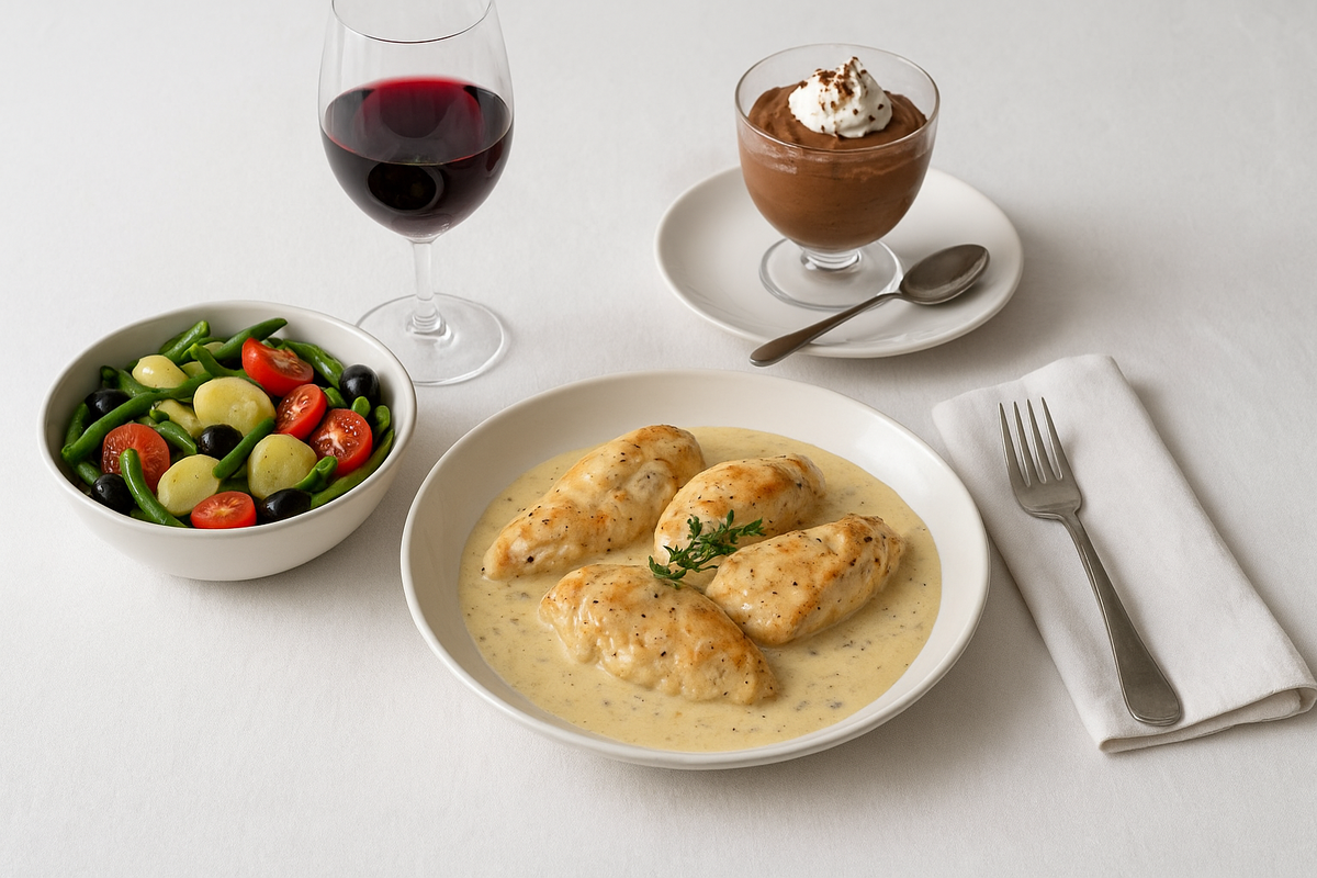 Традиционный французский обед состоит из трёх актов: И сегодня мы приготовим обед в парижском стиле: Поверьте, эти три блюда не просто насытят — они перенесут вас в атмосферу утреннего кафе на Монмартре. Совет от «Вкус мира»: добавьте пару капель белого вина в заправку — аромат станет изысканнее. Подавайте с картофельным пюре или рисом, обязательно полейте соусом.