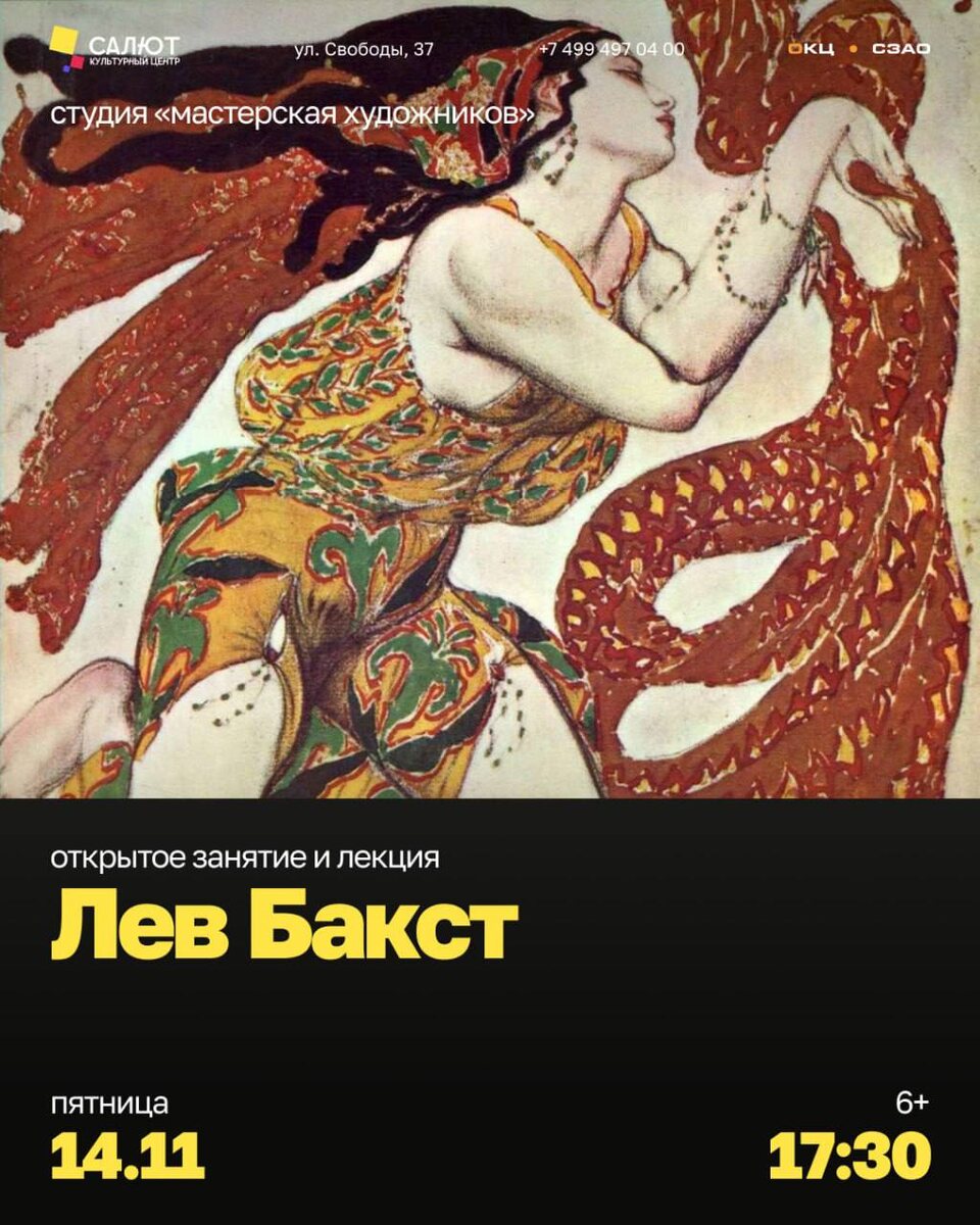 🎨 Открытое занятие-лекция от студии «Мастерская художников» 14 ноября в 17:30 приглашаем всех, кто вдохновляется искусством, на встречу под руководством заслуженного художника Российской Федерации Бориса Анатольевича Лысикова. Вас ждёт знакомство с творчеством Льва Бакста - выдающегося театрального художника, портретиста и законодателя парижской моды начала XX века. Погрузитесь в атмосферу эпохи, где искусство, стиль и сценография сплетаются в единое вдохновляющее полотно! 📅 14 ноября 🕠 17:30 📍 Культурный центр «Салют», ул. Свободы, 37 🎟 Вход по регистрации https://kulturnyy-tsentr-sa-event.timepad.ru/event/3670818/ #КЦСалют #МастерскаяХудожников #БорисЛысков #ЛевБакст #Искусство #КультураМосквы 📱 Подписывайся на наш канал, чтобы не пропустить интересные мероприятия и мастер-классы в СЗАО!