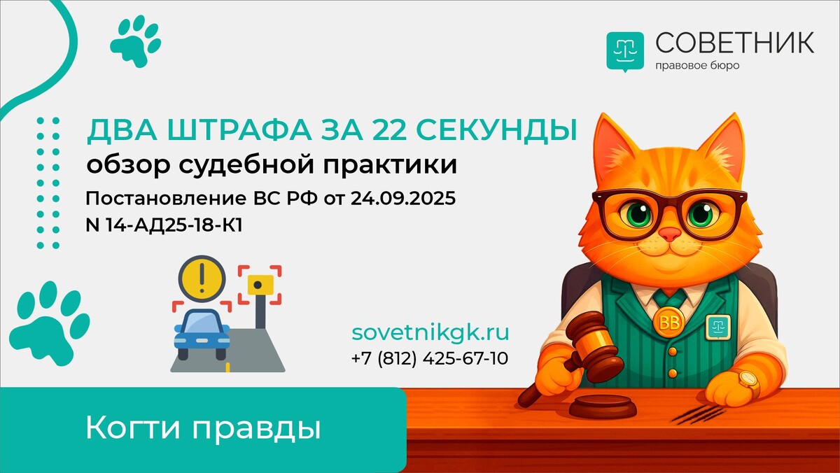 Ваш Адвокот Правомур сегодня вернулся с обзором судебной практики из Верховного суда. Тема на первый взгляд простая, но с юридическими когтями: можно ли оштрафовать водителя дважды за превышение скорости на участке, где камеры установлены всего в нескольких сотнях метров друг от друга? Разбираем ситуацию Транспортная компания попыталась оспорить два штрафа, полученные одним и тем же автобусом за превышение скорости на одном маршруте. Нарушения были зафиксированы с разницей всего в 22 секунды. Компания ссылалась на то, что водителя нельзя привлекать к ответственности дважды за одно и то же нарушение. Что решил суд? Суды всех инстанций — вплоть до Верховного суда — с этим не согласились. ВС РФ указал, что: — нарушения были зафиксированы разными камерами, — в разное время (пусть и с минимальным промежутком), — в разных точках дороги. — в каждом случае была зафиксирована своя скорость движения, а значит, каждое нарушение образует самостоятельный состав правонарушения. Фактически имело мест