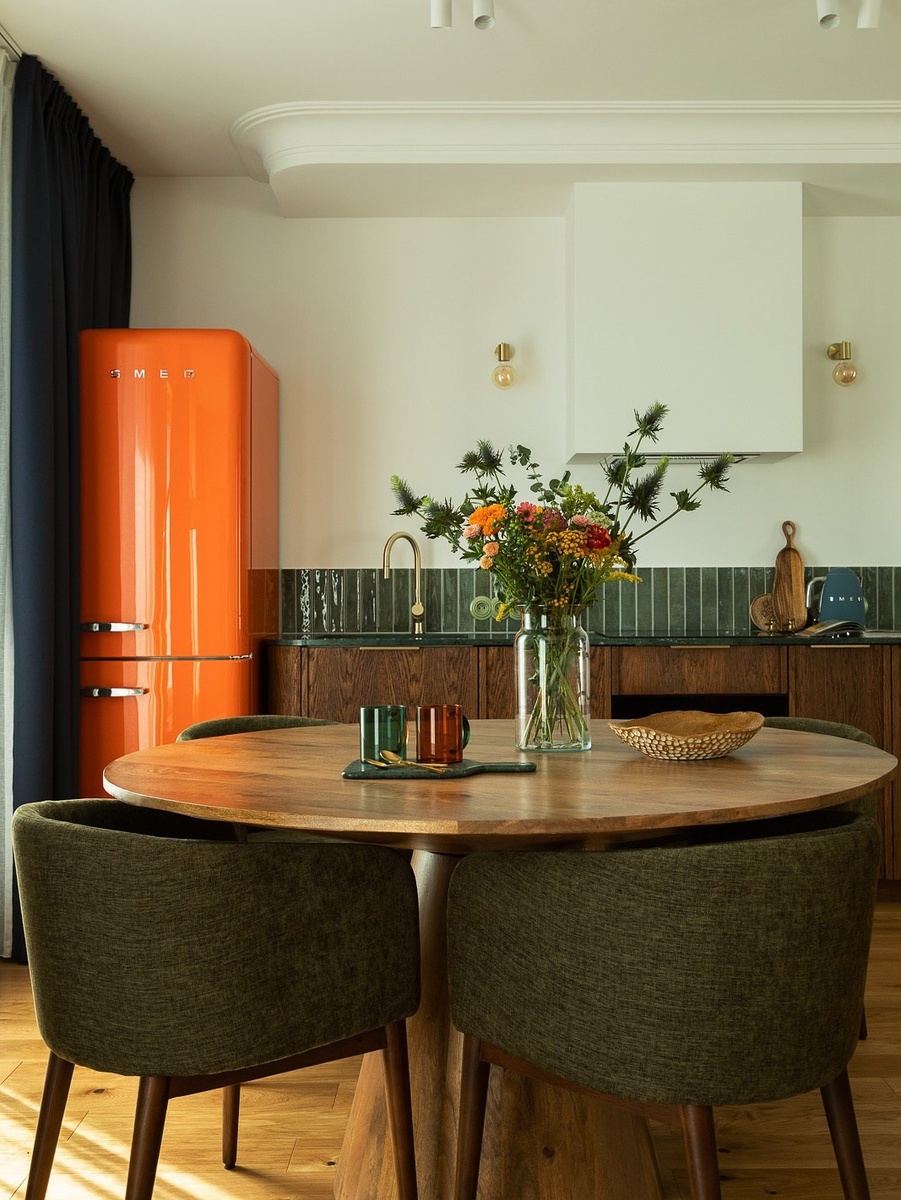 В данном интерьере очень гармонично соединены современные приемы отделки (именно это и делает интерьер актуальным, не устаревшим) и ретро тенденции, отраженные в линиях мебели. Давайте рассмотрим подробнее, как грамотно расставить ретро акценты, чтобы интерьер смотрелся современным... 1. Современная кухня + ретро формы холодильника и обеденной группы (классика мид сенчури). Обратите внимание, как виртуозно дизайнер увеличил/а количество дневного света и одновременно растворил в пространстве громоздкие колонны для хранения с помощью зеркальных фасадов. 2. Смешные акцентные обои - одновременно и современный акцент, и цвет, и ирония, свойственные стилю ретро, но на новый лад. В современных интерьерах не заклеивают обоями полностью всё помещение - только акцент. 3. Предметы одной стилистики перекликаются в разных помещениях: тумба на фоне обоев, тумба под ТВ, желтая лампа в спальне и обеденная группа принадлежат к стилю мид сенчури; стеллаж над ТВ, стеллаж в спальне и консольные полки в