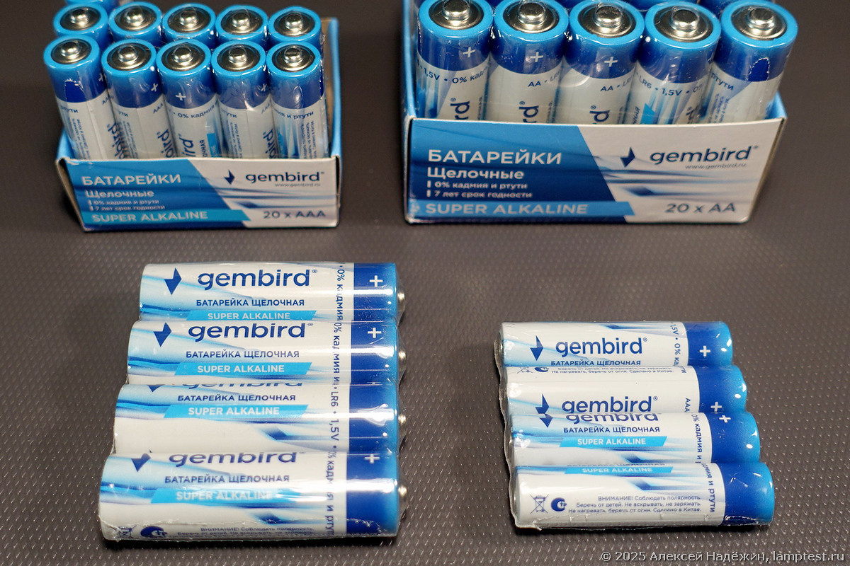 В продаже появились батарейки бренда Gembird, известного по компьютерным аксессуарам. Я протестировал почти весь ассортимент, в том числе самые популярные щелочные (Alkaline) элементы питания AA и AAA. Название компании Клавторг известно лишь специалистам, но бренды, принадлежащие ей, знают многие: это Gembird, Cablexpert, energenie, Konoos, Гарнизон. В этом году огромный ассортимент Клавторга пополнился батарейками. В первой партии щелочные и солевые АА и ААА, солевые C, щелочные D, солевые 9V ("Кроны"), литиевые CR123A, CR2032, CR2025, CR2016, CR2450, CR1632, CR1220, щелочные "таблетки" LR44, LR41, LR54, LR66. Чтобы не перегружать статью большим количеством цифр, покажу результат тестирования батареек Gembird Super Alkaline AA и AAA. Эти батарейки продаются в коробках по 20 штук (в коробке лежат спайки по 4 батарейки). Батарейки тестировались с помощью анализатора химических источников тока Яростанмаш АСК2.5.10.8. Для тестирования ёмкости и нагрузочной способности по два экземпляра б