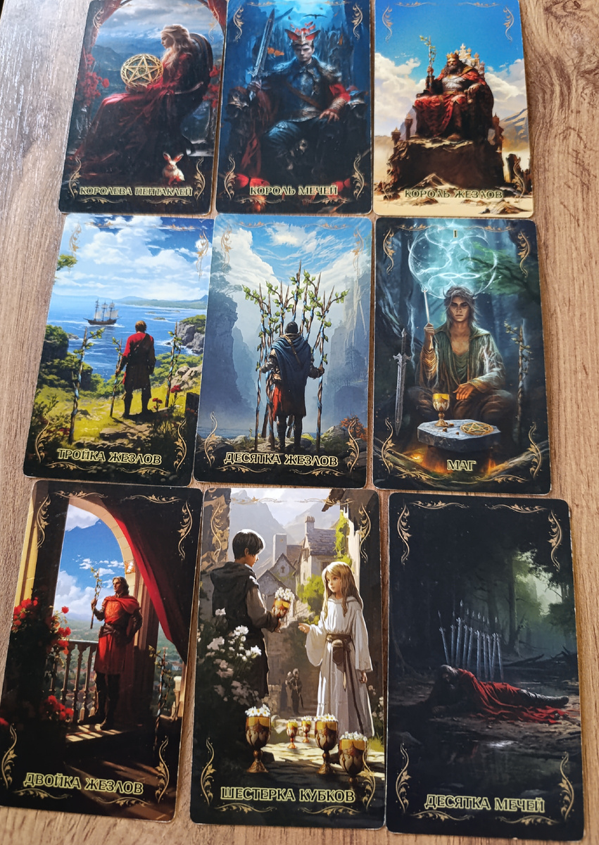 -- Первая строка: Королева Пентаклей, Король Мечей, Король Жезлов Это люди или энергии, символизирующие три разных качества. На пороге — важные решения с лидерским и ответственным оттенком: - Королева Пентаклей: стабильность, забота, практичность, материальное благополучие, умение организовать быт и ресурсы. - Король Мечей: логика, аналитика, справедливость, взвешенные решения, умение контролировать ситуацию. - Король Жезлов: энергия, харизма, вдохновение, лидерство, стремление к достижению целей. Событие 1: Возможна встреча или влияние трех разных ролей – практичности, разума и страсти. Сейчас важно объединить эти качества для выработки успешной стратегии. --- -- Вторая строка: 3 Жезлов, 10 Жезлов, Маг Это развитие событий, перемены и начало нового этапа, но с нагрузкой: - 3 Жезлов: ожидание результата, планирование, первые шаги за пределы привычного. - 10 Жезлов: тяжесть ответственности, перегрузка, необходимость нести большой груз, но близок финиш. - Маг: ресурсы и возмо