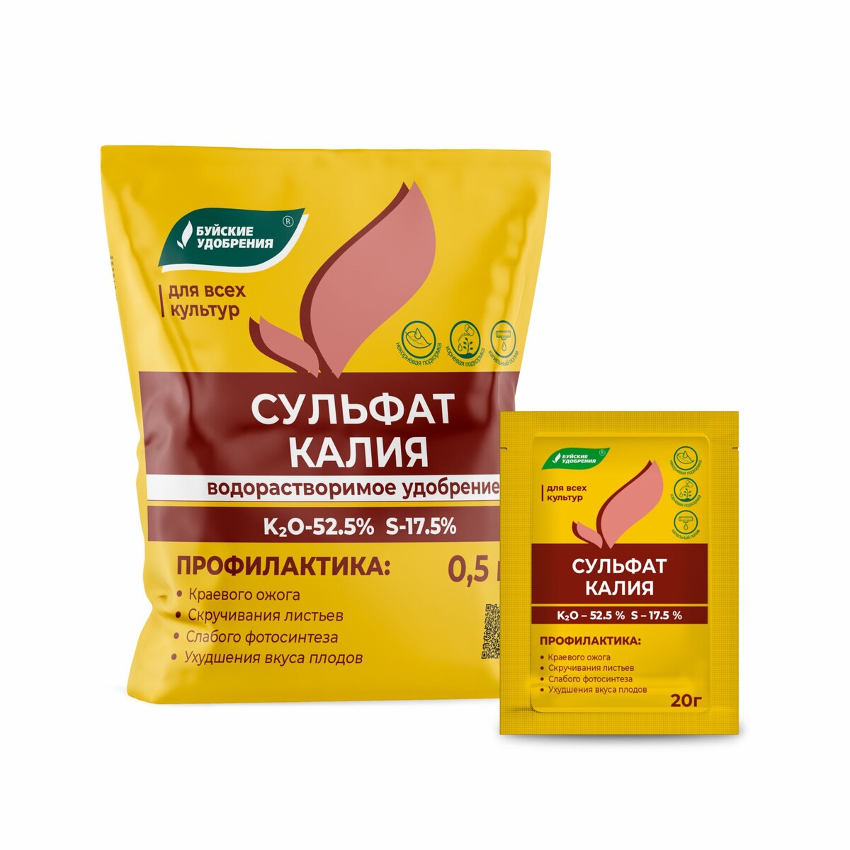 Сульфат калия (водорастворимое удобрение) выпускается ОАО "Буйский химический завод" в пакетах по 20 гр, 500 гр и 20 кг. Сульфат калия — это удобрение для качественного урожая! Его стоит использовать, когда вы хотите получить не просто много, но и вкусных, лежких, богатых сахарами и витаминами плодов. Применяйте его согласно сезонным потребностям растений в садоводстве и огородничестве. Краткая характеристика: Состав: K₂O - 52,5% (калий), S - 17,5% (сера). Внешний вид: кристаллы от белого до желтовато-серого цвета. Растворимость: высокая, что делает удобрение пригодным для корневой и листовой подкормки. Важная особенность: не содержит хлора, что выгодно отличает его от хлористого калия и делает идеальным для культур, чувствительных к хлору. Полезные свойства и преимущества: 1. Интенсивное питание калием, который является ключевым элементом для: 2. Источник доступной серы, которая необходима для: 3. Отсутствие хлора - это главное преимущество для таких культур, как: Когда лучше применят
