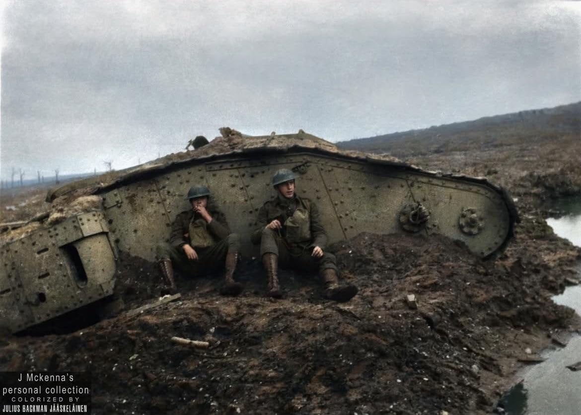 Британские солдаты отдыхают возле подбитого танка Mark IV, около 1917–1918 года. Эта фотография, вероятно, была сделана другим сослуживцем. Подобные «фронтовые» снимки, сделанные британскими солдатами, встречаются крайне редко, так как фотографирование такого рода было строго запрещено. Запрет был введён в марте, апреле и сентябре 1915 года: за съёмку или хранение камеры можно было попасть под военный трибунал. Обычным солдатам грозило до 112 дней ареста, а офицерам — немедленное и бесчестное увольнение из армии. Большинство военных отсылали свои фотоаппараты домой, однако некоторые тайно брали их с собой на фронт. Вероятно, были сделаны тысячи нелегальных снимков, но спустя сто лет такие фотографии стали чрезвычайно редкостью. Этот негатив на плёнке формата 127 был найден заброшенным на дне коробки с несвязанными стеклянными негативами. Его состояние было плохим, однако значимость снимка была очевидна. Фотография, скорее всего, была сделана с помощью карманной камеры Kodak Vest Poc