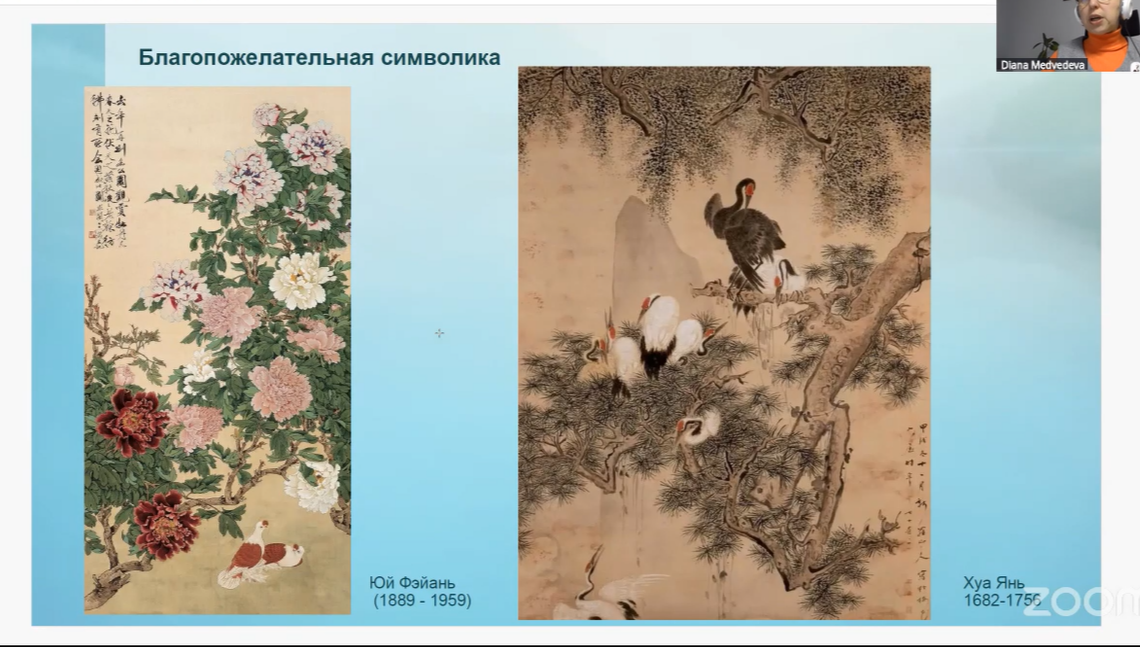 Мы говорили о разных художниках и стилях китайской живописи, символике пионов, сосен, журавлей и других символа и мотивах.