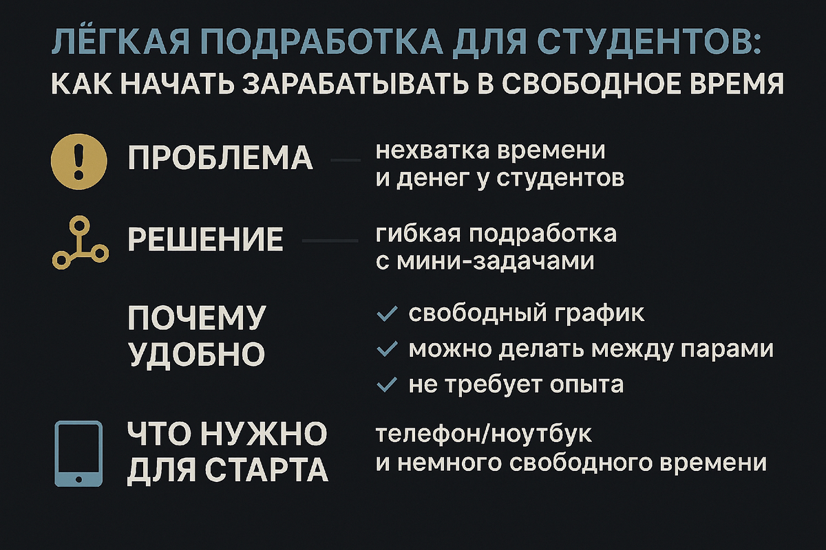 Честно? Я долго стеснялся говорить, что мне сложно совмещать учёбу и работу. Ну как сложно… иногда казалось, что я живу в постоянном марафоне: лекции, семинары, пересдачи, лабораторные, внезапная контрольная, о которой никто не предупреждал. А деньги тем временем уходили куда-то быстрее меня в маршрутке.Пробовал, наверное, всё, что бывает у студентов. Курьер — чувствовал себя персонажем игры на выживание. Помощник на мероприятиях — вроде интересно, но домой приходил так, будто грузовик разгружал. Фриланс — заказы либо странные, либо оплату обещают «чуть позже». Это «чуть позже», как ты понимаешь, не наступало никогда.И вот однажды вечером, когда я по привычке подумывал, чем бы заняться, чтобы заработать хоть что-то, наткнулся на обсуждение одного типа подработки. Никаких огромных проектов, никаких «учи полгода — заработаешь потом». Просто серия небольших действий, которые легко вписать в расписание, каким бы сумасшедшим оно ни было.Если коротко: меня зацепило то, что этим можно занимат