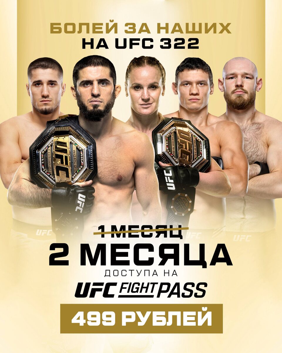 ⚡️ Подпишись на UFC Fight Pass на два месяца по цене одного и смотри бои до конца года! Впереди #UFC322, #UFCQatar и #UFC323, где выступят много бойцов из России и стран СНГ 🚀 🤖 Оформить подписку вы можете с помощью нашего бота @UfcFightPassRussiaBot