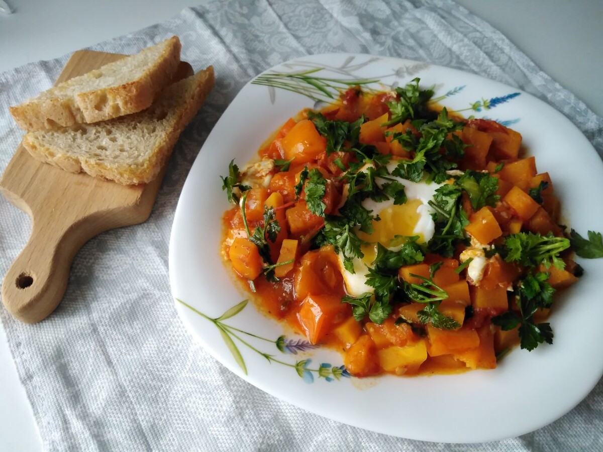 Всем привет! Обожаю этот рецепт, за вкус, быстроту приготовление и за то, что тыква смягчает кислинку помидоров. • Первоначально я чищу тыкву от кожуры и семечек. Нарезаю на небольшие кубиками, стараюсь, чтобы они были действительно небольшие и примерно одинакового размера, так вкуснее. Отправляю тыкву на сковороду с разогретым маслом. Накрываю крышкой и оставляю её томиться на небольшом огне. • Далее нарезаю кусочками помидоры. Я пока нарезала остатки урожая этого года, поняла, что на всю семью этого будет мало и добавила замороженный помидор. Нарезав помидоры я их отправила к тыкве на сковороду. Перемешала, накрыла крышкой, добавила чуть-чуть огня побольше и оставила доготавливаться. • Когда тыква стала мягкой необходимо посолить, добавить любимые специи. Я просто посолила адыгейской солью. • Яйца тщательно моем, чтобы избежать инфекции, так как желтки мы оставляем почти сырыми (но не обязательно их так готовить, если любите вкрутую, то пожалуйста). • Когда белки приготовятся