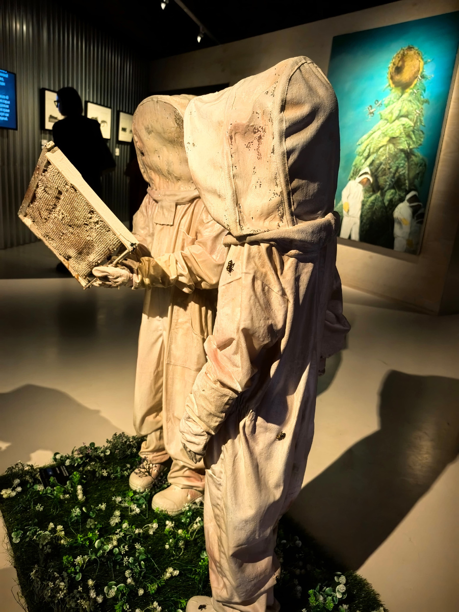 Это в первую очередь сама Анастасия Кузнецова-Руф — её работы, как всегда, кинематографичны. Почерк узнаётся сразу: коричневатый фон, уголь, острый рисунок. Как будто на холсте стоп-кадр из фильма — очень точно, эмоционально, глубоко. Также был рад увидеть Антона Кузнецова (в проекте с Марией Сафроновой «Зона пчёл»). С работами Антона я хорошо знаком — он один из наших авторов. Но здесь было иначе: если обычно его стиль считыва