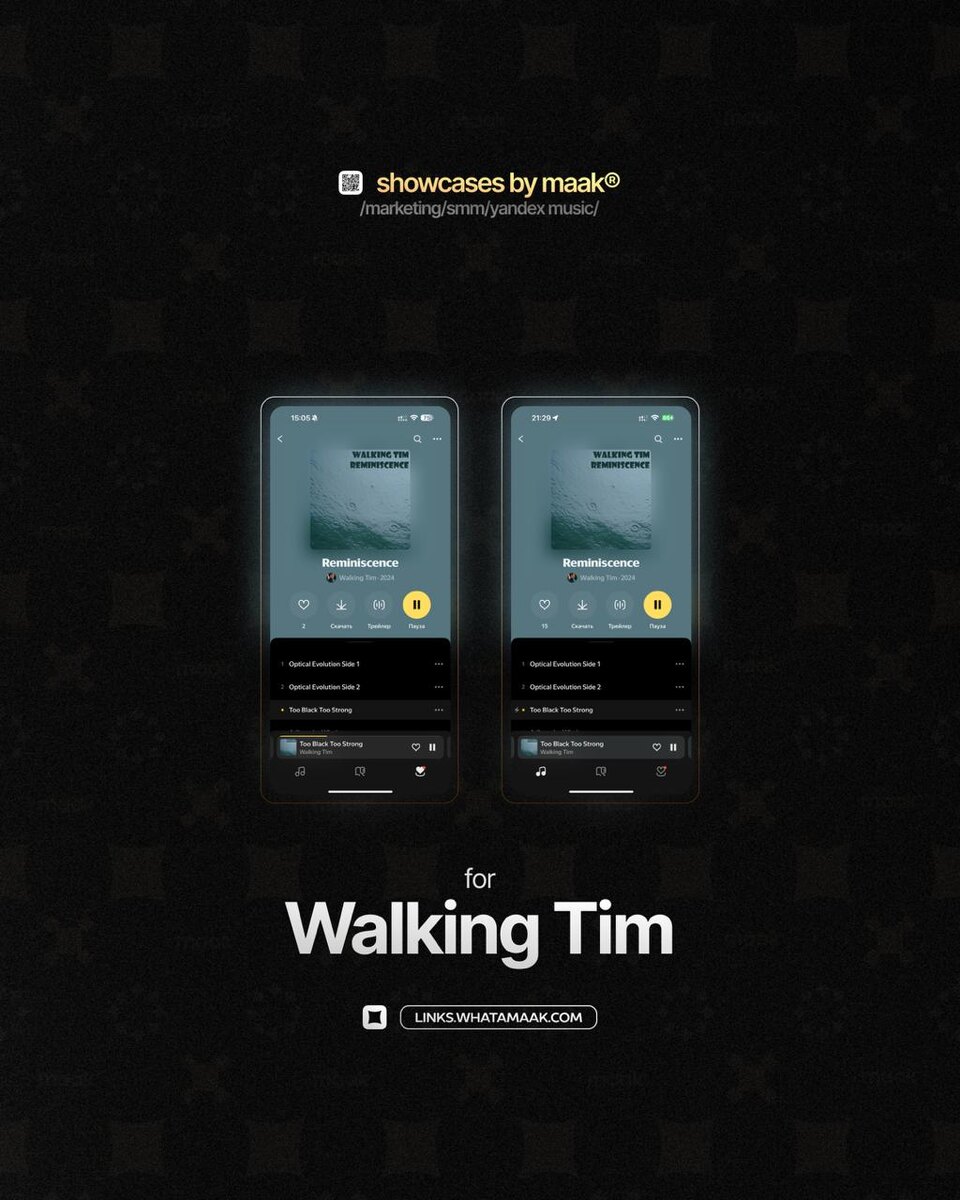 📱 #case — Продвижение в Яндекс Музыке ❤️ Для кого? Walking Tim 🔼 Что было сделано? Комплексное продвижение трека с целью увеличения прослушиваний и вовлеченности 🛒 Заказать 🔍 Другие услуги ℹ️ #яндексмузыка #yandexmusic 🔗 maak® × подробнее