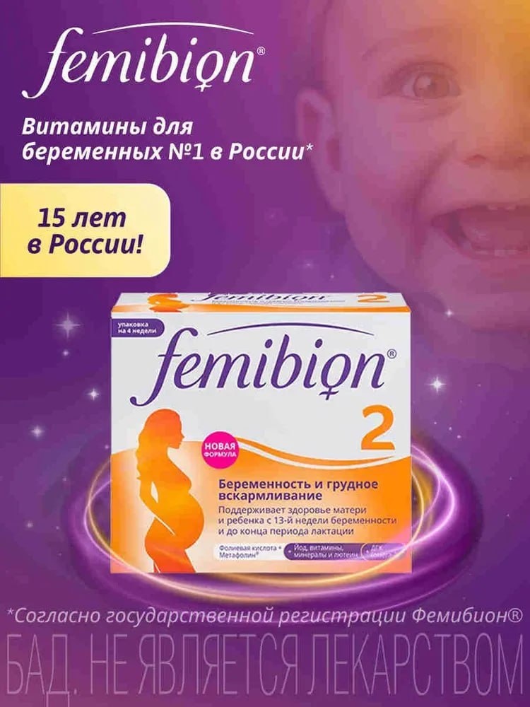 Фемибион 2 комплекс витаминов для беременных и кормящих женщин, 28 табл. Фемибион 2 – это мультивитаминный комплекс для беременных и кормящих женщин. Витамины для беременных Фемибион помогают поддерживать здоровье мамы и ребенка. Упаковка содержит 28 таблеток, что обеспечивает необходимое количество витаминов начиная с 13-й недели беременности и до конца периода лактации. Продавец - Ozon Россия. Цена: 1293 руб. Дополнительно: 670 баллов кешбэк на любые покупки. Ссылка: ozon.ru/t/QoaJAfN