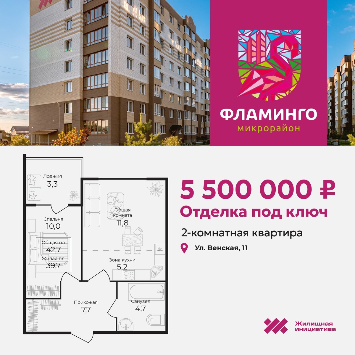 Квартиры во Фламинго: современный микрорайон, удобные планировки, семейная ипотека от 4,5%. Предлагаем двухеомнатную квартиру, ул. Венская, 11, отделка под ключ. Общая площадь 42,7м2, изолированные комнаты (спальня 10м2, общая комната 11,8м2 с зоной кухни 5,2м2). Выход на лоджию (3,3м2) из спальни. Просторная прихожая 7,7м2. Цена 5 500 000р. Строим город, в котором хочется жить! Наш сайт: www.nsk-kvartal.ru