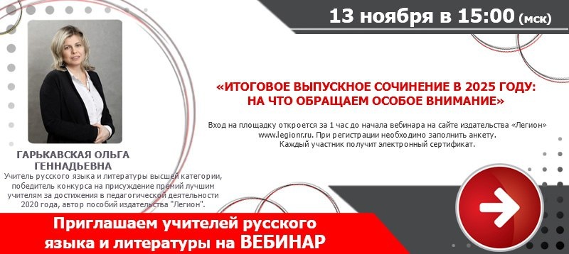 Вебинар "Итоговое выпускное сочинение в 2025 году: на что обращаем особое внимание" Дата: 13 ноября. Время: 15:00 Эксперт Гарькавская Ольга Геннадиевна - учитель русского языка и литературы высшей категории, победитель конкурса на присуждение премий лучшим учителям за достижения в педагогической деятельности 2020 года, автор пособий издательства "Легион". Участие бесплатное. Требуется регистрация
