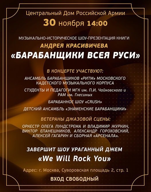 «Барабанщики всея Руси» выступят в Москве 30 ноября 2025 в 14.00 в Центральном Доме Российской армии им. М.В. Фрунзе (ЦДРА) состоится музыкально-историческое шоу исполнителей на ударных инструментах «Барабанщики всея Руси». https://www.classicalmusicnews.ru/anons/barabanshhiki-vseya-rusi-vystupyat-v-moskve/?utm_source=cmn_own&utm_medium=telegram 🎼 ClassicalMusicNews.Ru | Telegram | ВК | МАКС