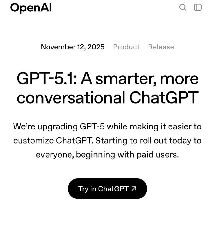 👐 OpenAI выпустили GPT-5.1. Эта быстрая instant-версия стала более «теплой» и разговорчивой, при этом сохранив свою полезность и лучше следуя инструкциям. Она также способна глубже размышлять над сложными задачами для получения более точных ответов, особенно в технических вопросах. «Размышляющая» модель стала более эффективной — она тратит больше времени на сложные вопросы и быстрее отвечает на простые. Уже сегодня начнется открытие доступа для платных подписчиков, а затем постепенно для всех. GPT-5.1 станет основной моделью в ChatGPT, но GPT-5 останется доступной для платных пользователей еще в течение трех месяцев. Также вскоре ожидается выпуск GPT-5.1 Pro. NeuroFlux #OpenAI #GPT5 #GPT51 #искусственныйинтеллект #модели #технологии #анонс #ChatGPT #подписка #инновации