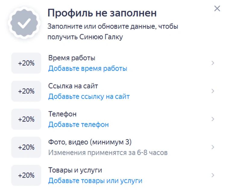 — Если профиль уже есть, то заходим в личный кабинет «Яндекс Бизнеса» и начинаем по очереди заполнять все разделы в блоке «О компании». Это программа максимум: так карточка будет ранжироваться лучше всего. Программа минимум добавить график работы, ссылку на сайт ресторана, телефон, хотя бы 3 фото и меню. Тогда заведение получит синюю галочку: она поможет укрепить доверие гостей и улучшить карму в выдаче. Например, если у двух кафе одинаковый рейтинг и плюс‑минус столько же отзывов, но у одного есть синяя галочка, а у другого нет — на более высоких позициях окажется именно то, что с галочкой.