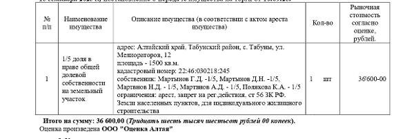 Название: 1/5 доля в праве общей долевой собственности на земельный участок, земли населенных пунктов для индивидуального жилищного строительства, кадастровый № 22:46:030218:245, площадь 1500 кв.м., адрес: Алтайский край, Табунский район, с. Табуны, ул. Мелиораторов, 12. Начальная цена 36 600 руб. (Мартынов Г.Д., Мартынов Д.Н., Мартынов Н.Д., Мартынов А.Д., Полякова К.А., арест, запрещения регистрации, ст. 56 ЗК РФ) (1588) Канал: Госземля Алтайский край Область: край Алтайский Алтайский край Район: Табунский район Населенный пункт: с. Табуны, ул. Мелиораторов, 12 Локация: Смотреть на карте ВРИ: Для индивидуального жилищного строительства Кадастровый номер: 22:46:030218:245 Кадастровая стоимость: - Вид сделки: Продажа Площадь: 1500 м² Начальная цена: 36600.00 руб. Дата завершения: 10.12.2025 Подробнее: ГИС ТОРГИ #госземля #земляотгосударства #земля #земельныйучасток #земельныеторги #торги #аукцион #продажаземли #продажа #алтайскийкрай
