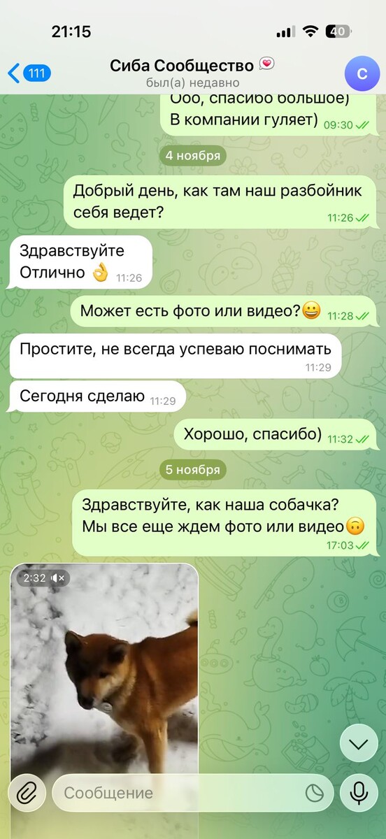 На момент сдачи нам обещали, что каждый день будут присылать свежие фото и видео — и мы, как настоящие родители этого рыжего ребенка, ждали этого с замирающей душой. Обещали, что каждый день нам будут показывать, как наш малыш ест, играет, спит, а может, даже делает что-нибудь умное — типа сидит на лапках или поет песню… В общем, вот такого рода были обещания. В итоге: каждое утро — короткий ответ «все хорошо», «гулял, поел, спит». На вопрос «выслать фото?» , однажды пришлось прождать 1,5 дня. Каждый раз приходилось выпрашивать хоть какую то весточку от собаки.